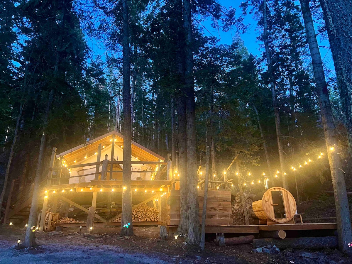 Welcome to our Mountain Treehouse Tent! 16x20 wall tent on raised platform with large deck with lake and forest views. Relax in the cedar sauna complete with cold plunge and outdoor (warm!) shower. Fresh mountain glacial spring water. Brand new outhouse 2025! Wood stove inside the tent for chilly evenings. Hike up to the top of the mountain for spectacular Flathead Lake views. Starry nights and wildlife galore. Please note I have additional listing on the same property if you need two tents⛺️🏕