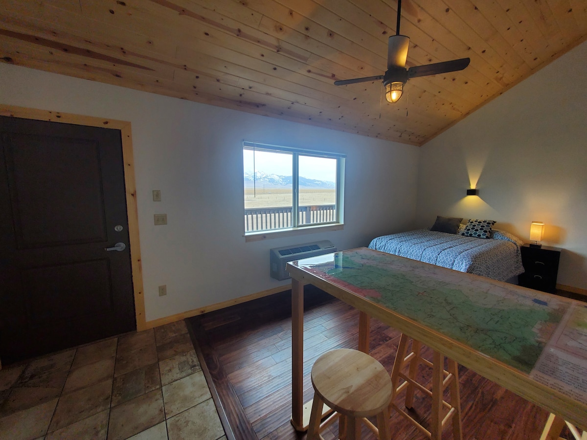 Newly built attached studio apartment. Secluded on a 6-acre parcel of property with very few nearby neighbors. Set up as a studio with private bath and full kitchen King Size bed, Love Seat, dining table, full size refrigerator & Mounted 50" TV with Roku streaming. Beautiful views of the Bridger Mountains and Gallatin Valley! Central location: 15 minutes to downtown Bozeman, 5 minutes to the airport, 30 minutes to Bridger Bowl ski area. 1 hour to Big Sky area.