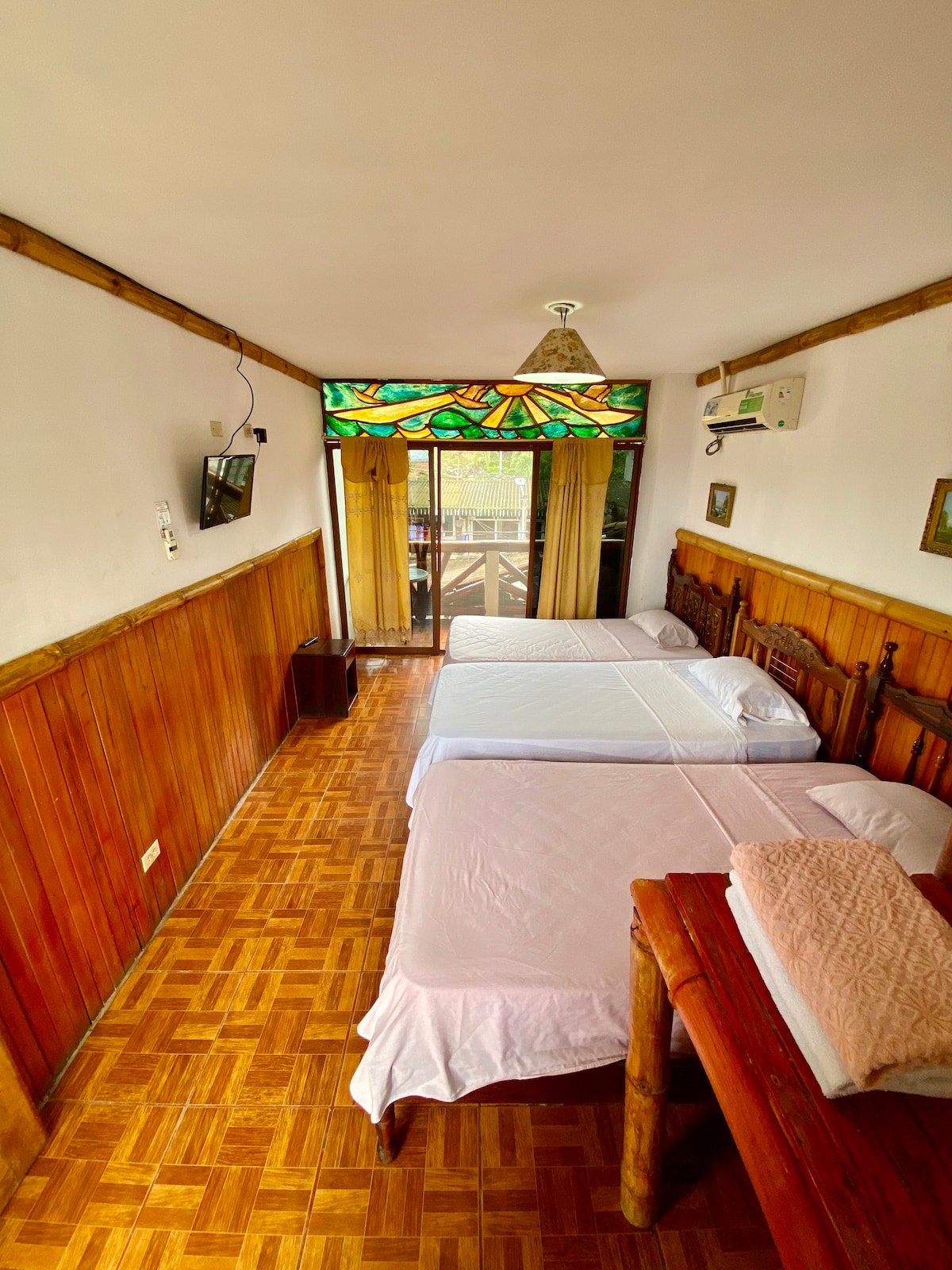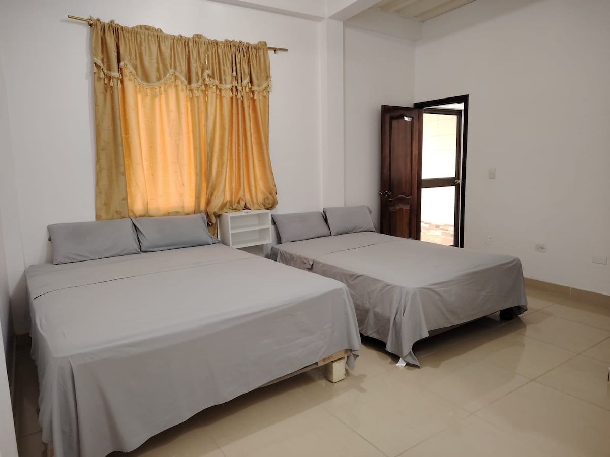 Habitación en planta baja con una cama matrimonial y dos literas de 1.5 plazas, ideal para grupos o familias de hasta 6 personas. Tiene aire acondicionado, baño privado funcional, Smart TV con Netflix, estante tipo armario y colgador de ropa. Cómoda y bien ventilada. Acceso libre a piscina, cocina, parrilla, jardines, hamacas y más. A solo 7 minutos de la playa y del centro de Montañita, pero alejado del ruido. Tranquilidad y espacio para compartir.