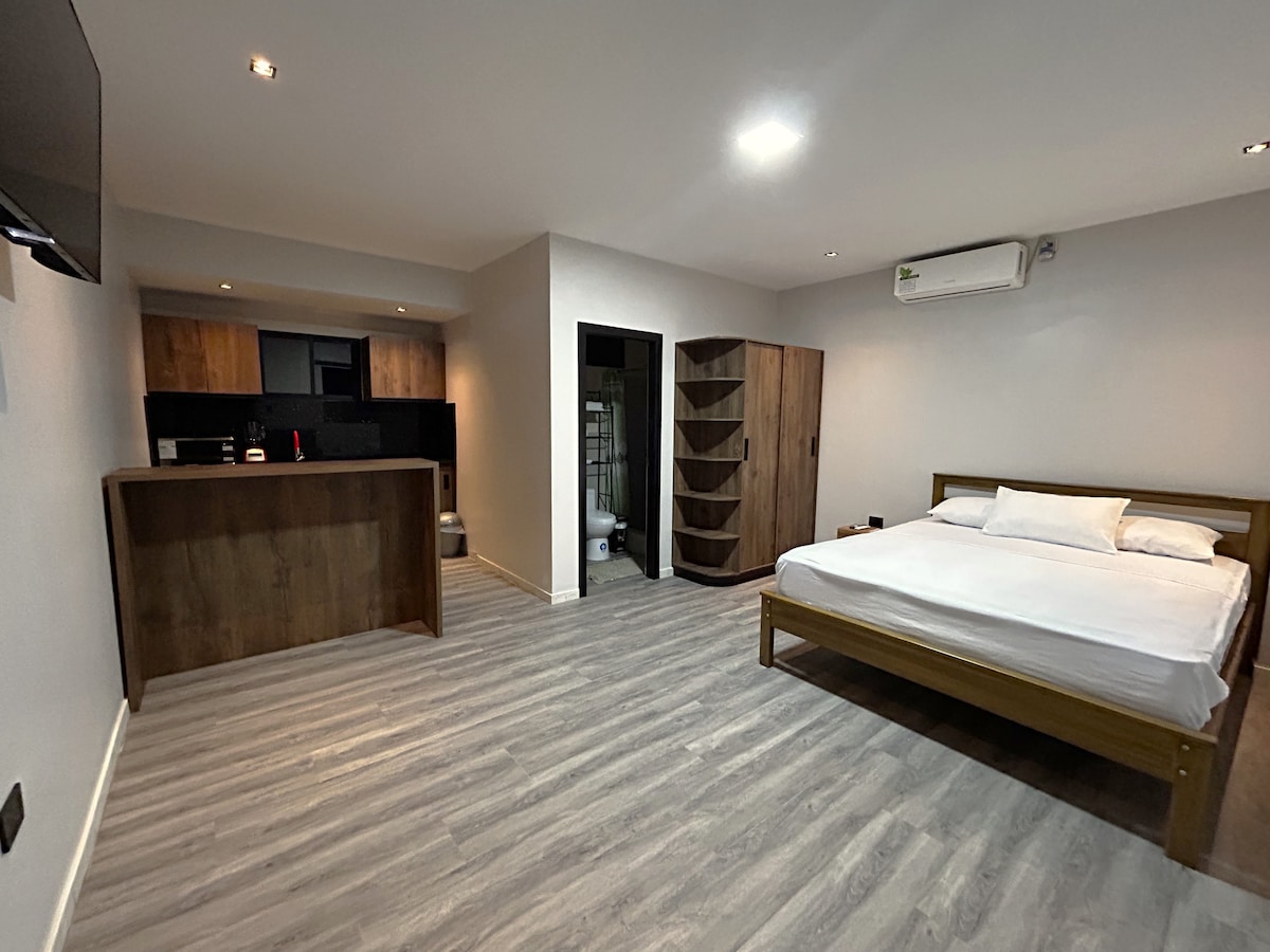 La suite combina elegancia, simplicidad y naturaleza, creando el ambiente perfecto para descansar, trabajar con tranquilidad o disfrutar de una escapada romántica en Olón. Al entrar, te recibe una sala luminosa con sofá amplio y detalles artesanales que crean una sensación de paz. La habitación principal cuenta con una cama King muy cómoda, iluminación cálida y un diseño natural en bambú que eleva la atmósfera de relajación.