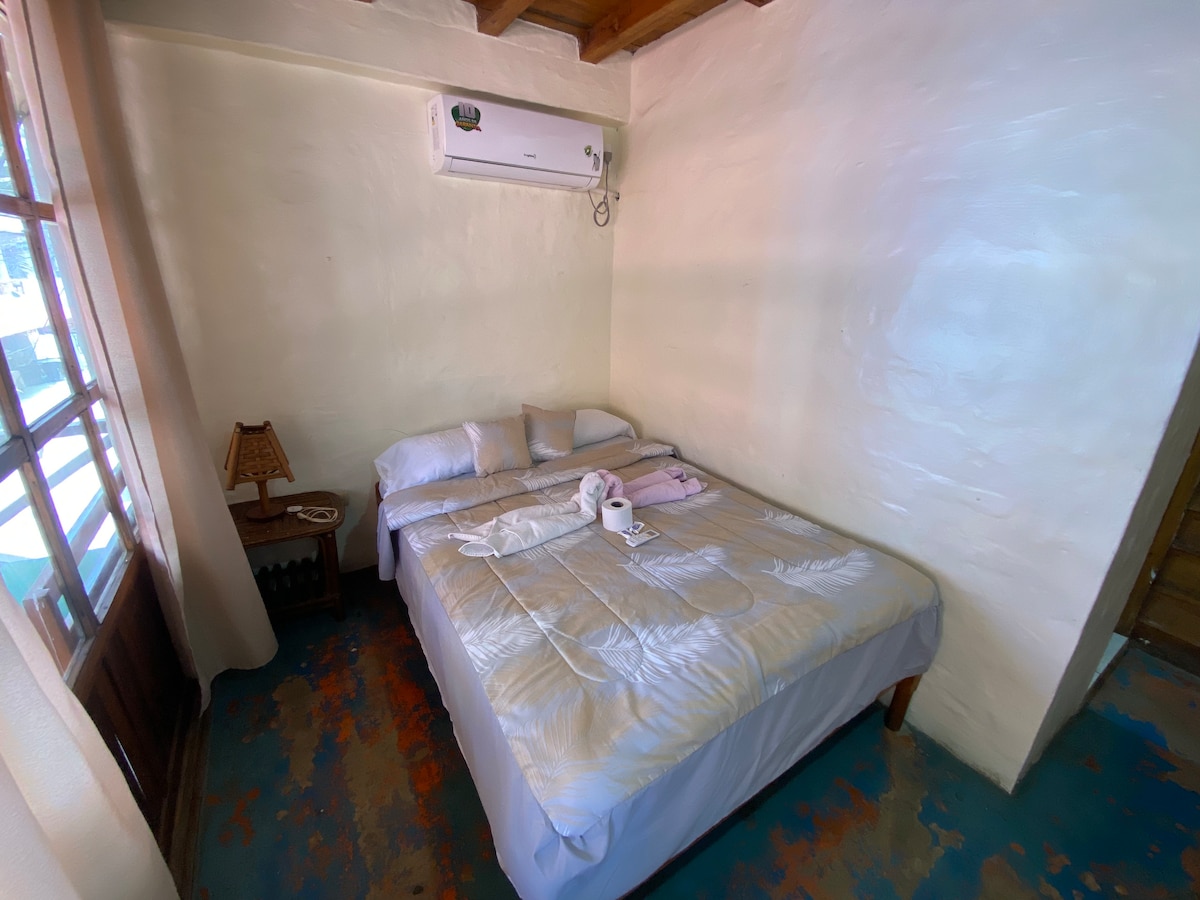 Para 2 personas. Simple. Rústica .eco-friendly. clase económica. Ideal para descansar. Y disfrutar de todas las instalaciones que tiene el jardín natural. Zona de hamacas. Parrilla. Cocina compartida. Y a 10 metros de la playa.(Baños compartido). Zona de restorant en la playa, con lo mejor de la gastronomía fusión argenta-ecuatoriana y los mejores cócteles y cervezas heladas. Si te gusta o sos amante del surf 100 mts de la punta.( surf point) 350 mts de pueblo.( zona rosa).