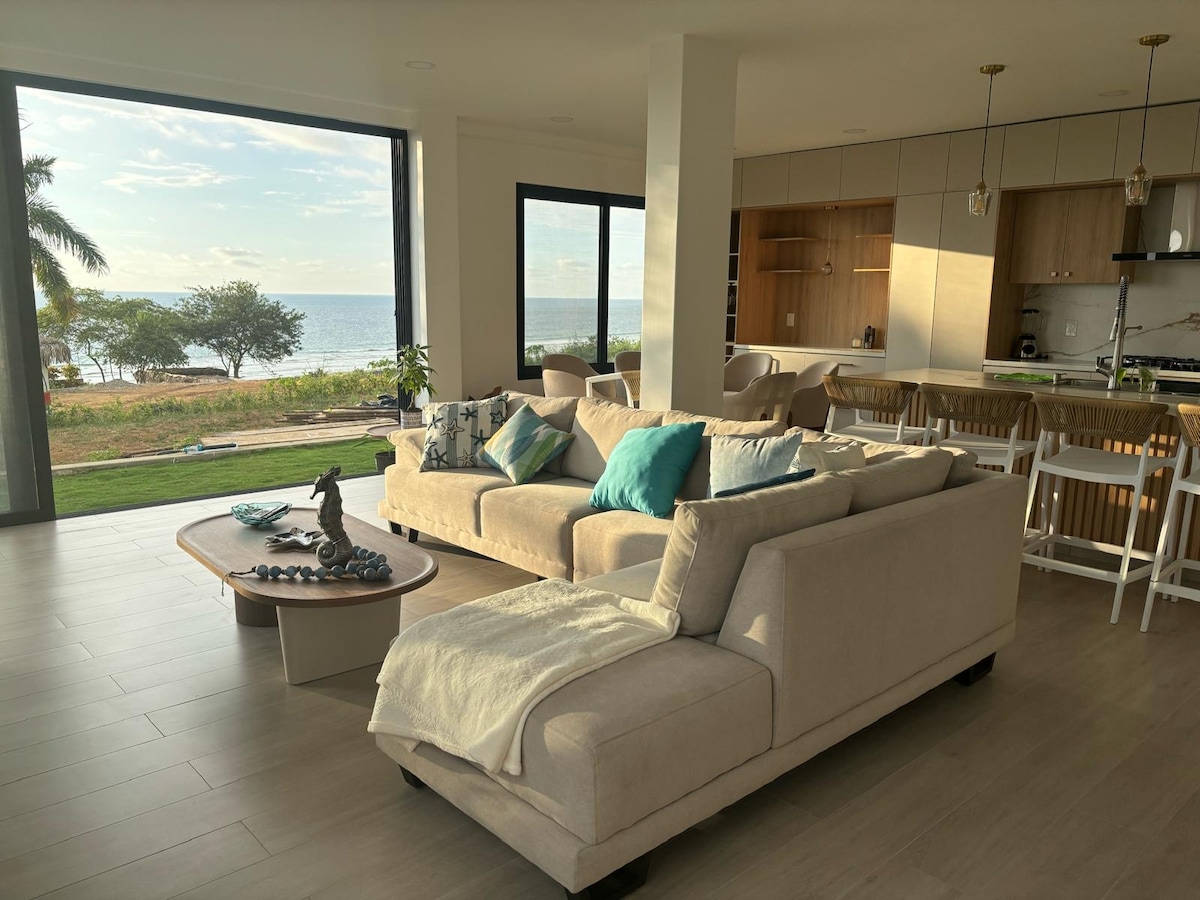Amazing beachfront 1rst floor apartment, near Olon 3 bedroom 4 bath with fantastic sea views from the balcony, a few steps from the beach sand, with an incredible large pool/infinity jacuzzi, with barbecue grill, beach palapa social area, with a fire pit, full beach bathroom, fully equiped with verything you need in kitchen, and air conditioners in each room and internal social area, big balcony social area, property is fully fenced, and main gate is remote controlled and motorized.