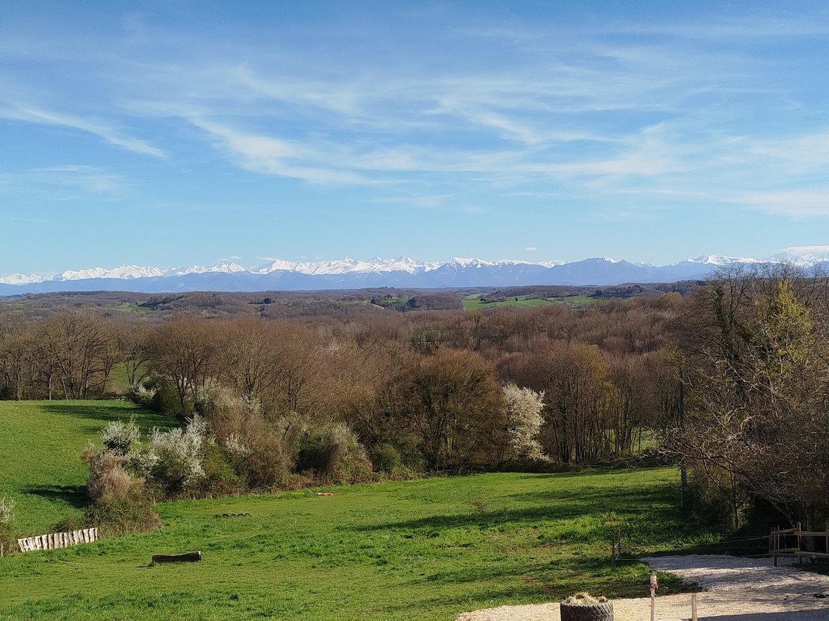 Cabane en bois avec magnifique vue sur les Pyrénées. Très lumineuse par son exposition plein sud. Terrasse avec braséro pour vivre des moments conviviaux autour du feu. Un sauna avec poêle à bois est disponible (non attenant), à tout moment, pour un moment de détente. A 8km d'Aspet, ou se trouvent les commerces, restaurants, cafés, marché 2 fois par semaine, ... Nombreux chemins de randonnées, parapente, centre équestre, VTT, ski, raquettes, spéleo, escalade, ...