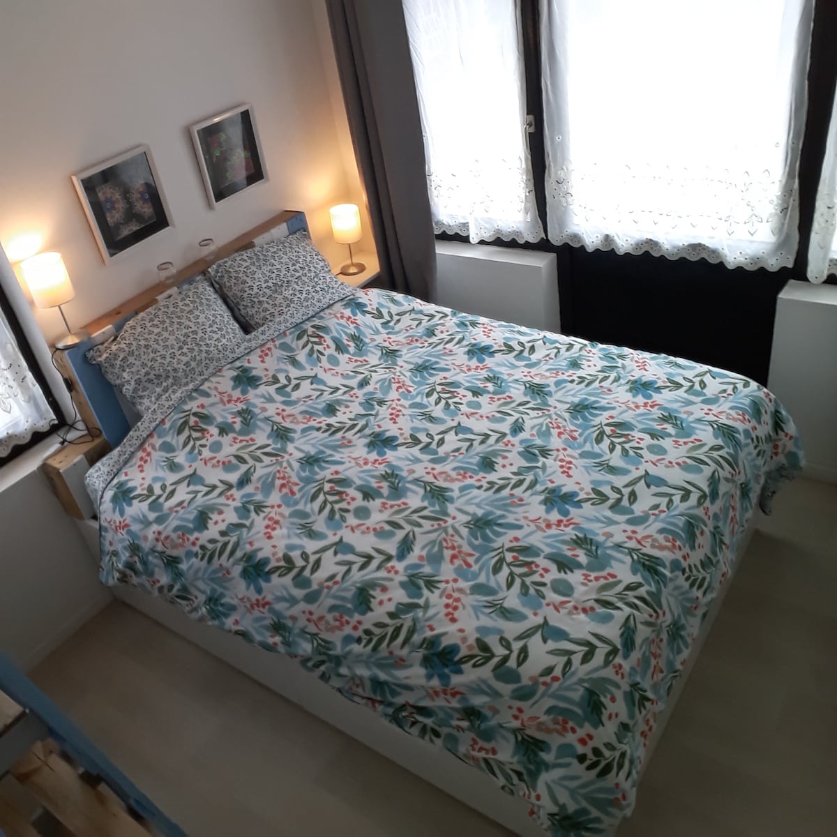 Résidence avec parking (fermé entre 22h et 6h, accès par code). Salon/cuisine : canapé convertible 2 places, TV, Wifi, four électrique, plaque au gaz de ville, bouilloire, cafetière Senseo, micro-ondes, vaisselle pour 4. Chambre 1 : lit 2 places 140x190 avec matelas de qualité , penderie. Salle d'eau : douche, lavabo, WC, lave-linge. (l'accès à la salle d'eau se fait par la chambre 1). Chambre mezzanine (sous pente) : lit 1 place. Accès par un escalier raide. Boite à clé connectée.