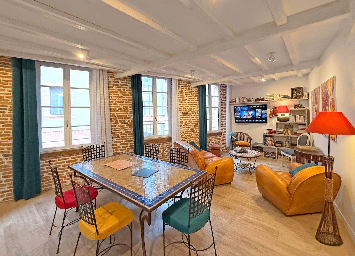 Appartement de charme, calme, dans un immeuble ancien entièrement rénové, situé dans le centre historique de Montauban, il dispose d'une terrasse privative avec vue sur le Tarn et le pont vieux. A 50 mètres du Musée Ingres Bourdelle, à 150 mètres de la Place Nationale de ses lieux de vie, des animations du cœur de bastide, cet appartement est idéalement placé pour découvrir Montauban et son Histoire. Très bien équipé, il est aussi adapté aux professionnels.