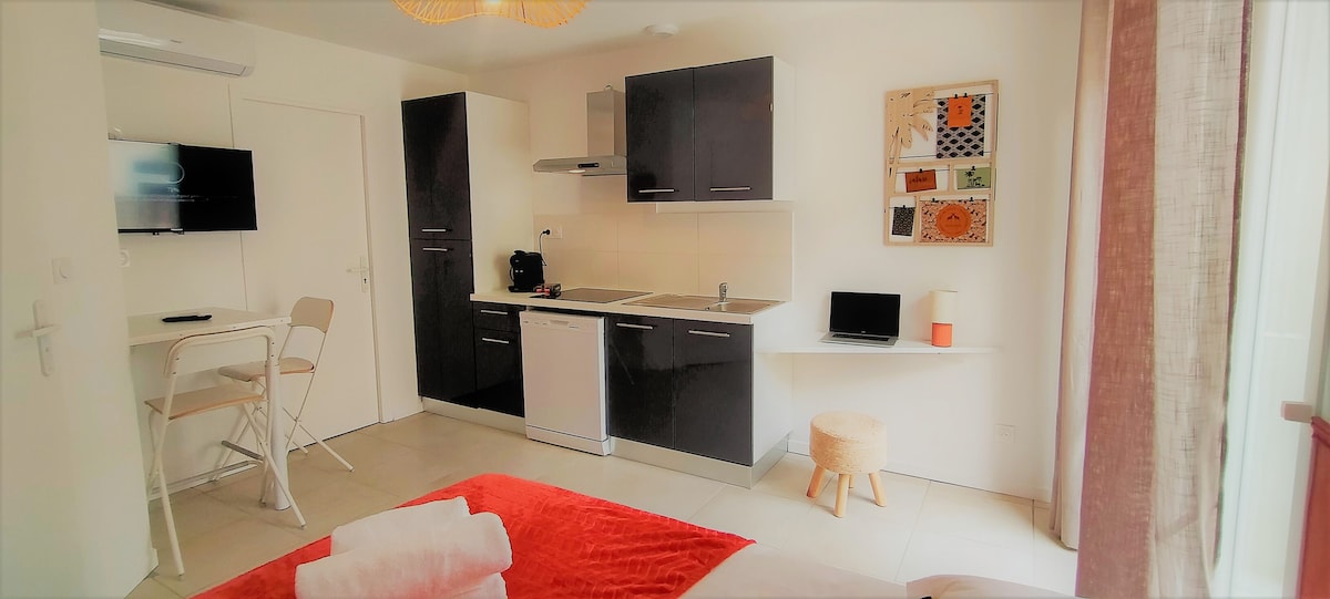 Studio moderne et climatisé avec fibre, Netflix et cuisine équipée. Idéal pour vos séjours pro ou détente à Aussonne, à proximité du MEET, d’Airbus et de la clinique des Cèdres. Terrasse privée sans vis-à-vis, parking couvert gratuit, linge fourni. Lave-linge, sèche-linge, espace de télétravail. Entrée autonome via boîte à clés connectée. Logement non-fumeur, literie confortable. Rez-de-chaussée calme et sécurisé. Bienvenue !