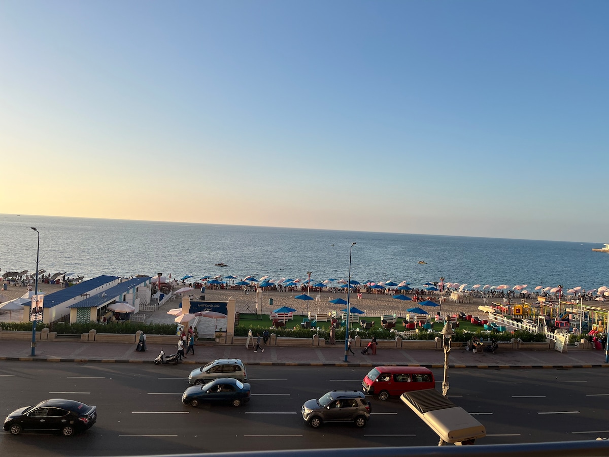 Stunning beachfront apartment with panoramic sea views in the heart of Alexandria, on the 15th floor. Bright, spacious setting with modern amenities and a private balcony and beach access. The building offers 24/7 security and assigned parking. Steps from the beach and close to restaurants, cafés, and shops. Sleeps 6: • 3 bedrooms (2 king, 2 singles) • 2 bathrooms with showers • Large lounge, fully equipped kitchen • Fast WiFi, satellite TV, fresh linens •Fully air-conditioned •Elevator access