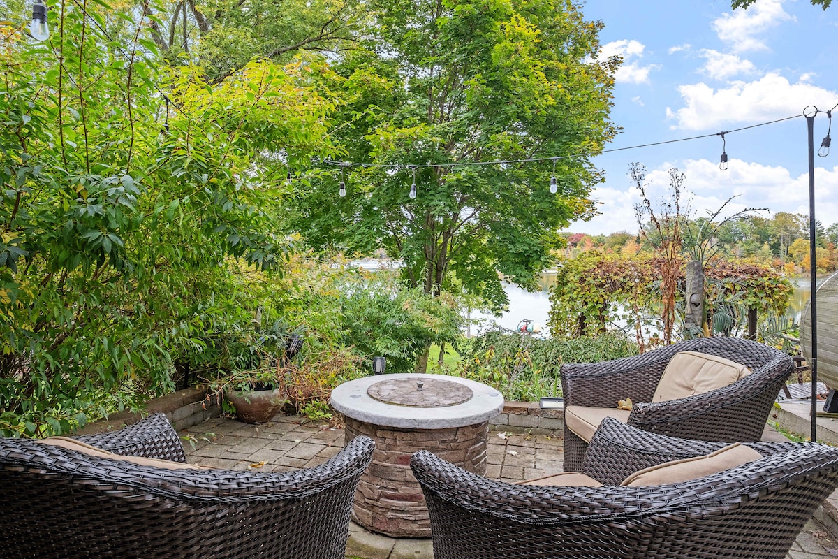 Your lakeside retreat! Kayaks, beach, trampoline, & HOT TUB await you - at your serene, 4-acre PRIVATE lake. Dive off the dock, hop on the bikes, challenge each other to our yard games - and try your hand at fishing! Step onto spacious deck for breathtaking lake views. Firewood is provided for lakeside campfires. Fully furnished kitchen included. Only 20 min. from golf and other lakes. Your relaxing stay will be packed with beauty & fun-filled amenities. Build memories & have endless family fun!