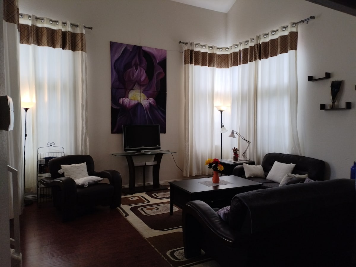 Relax with the whole family in a private one bedroom guest suite. The bedroom has (1) Cal King Bed and in the living area there is also a full size & twin size bed. The suite is has (2) TV's. Refrigerator, coffee maker and microwave are provided for your stay along with dishes. The suite is connected to the home by a double sided door. The door will remain locked on both ends. We are a short 10 min. drive to the Ont airport, Ontario convention center, Toyota arena and the Ontario Mill