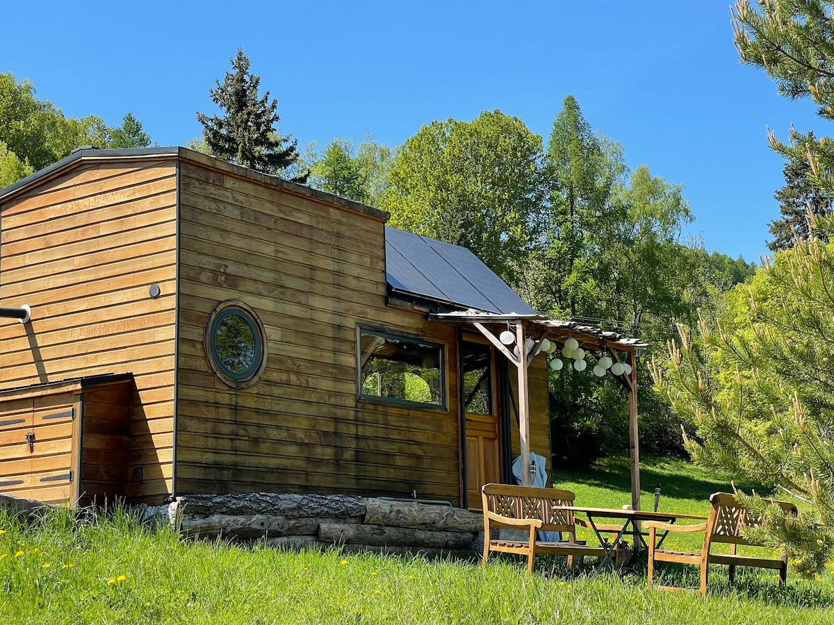Séjour agro-touristique dans une Tiny House tout confort avec vue panoramique sur les montagnes dans un cadre exceptionnel en pleine nature. Située proche d'un gîte rural, toutefois indépendante et autonome, elle est équipée d'une cuisine, d'un mini salon/salle à manger, d'une baignoire et de toilettes sèches. Venez savourer un moment de sérénité et d'authenticité dans un cadre cosy avec une vue imprenable sur le Morgon.