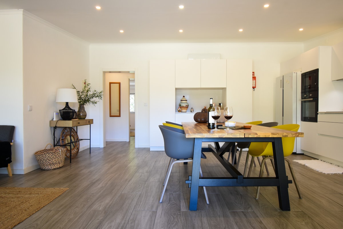 Apartamento reconstruído por arquitecto, excelente privacidade, exposição solar, com wifi, e praia a 150m. 1 suite com SPA e banho turco com aromaterapia. 1 suíte com terraço com vista mar, tela de projeção de cinema. Sala com vista de mar, rio, e terraço, onde poderá disfrutar de uma zona de estar e de um barbecue com grelha em ferro forjado. Perto de restaurantes, cafés e supermercado, e estação de comboio. Ar condicionado e piso aquecido em todas as áreas, TV 4K e box independente por suíte.