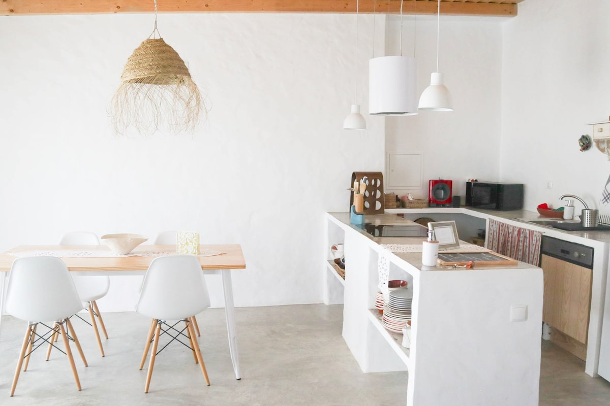 Studio open space with an independent entrance integrated in a house of contemporary architecture, where we live, next to a ruin of an old mill. Fantastic view of the countryside. Bed for 2 people, with the possibility of hosting another in an extra sofa (20 euros extra payment). Fully equipped kitchen. Magnificent bathroom. There is no central heating or air conditioning, but heater and fan are provided. The house is 25 minutes from the beaches of Comporta, Melides, Sines, etc. Fiber Internet.