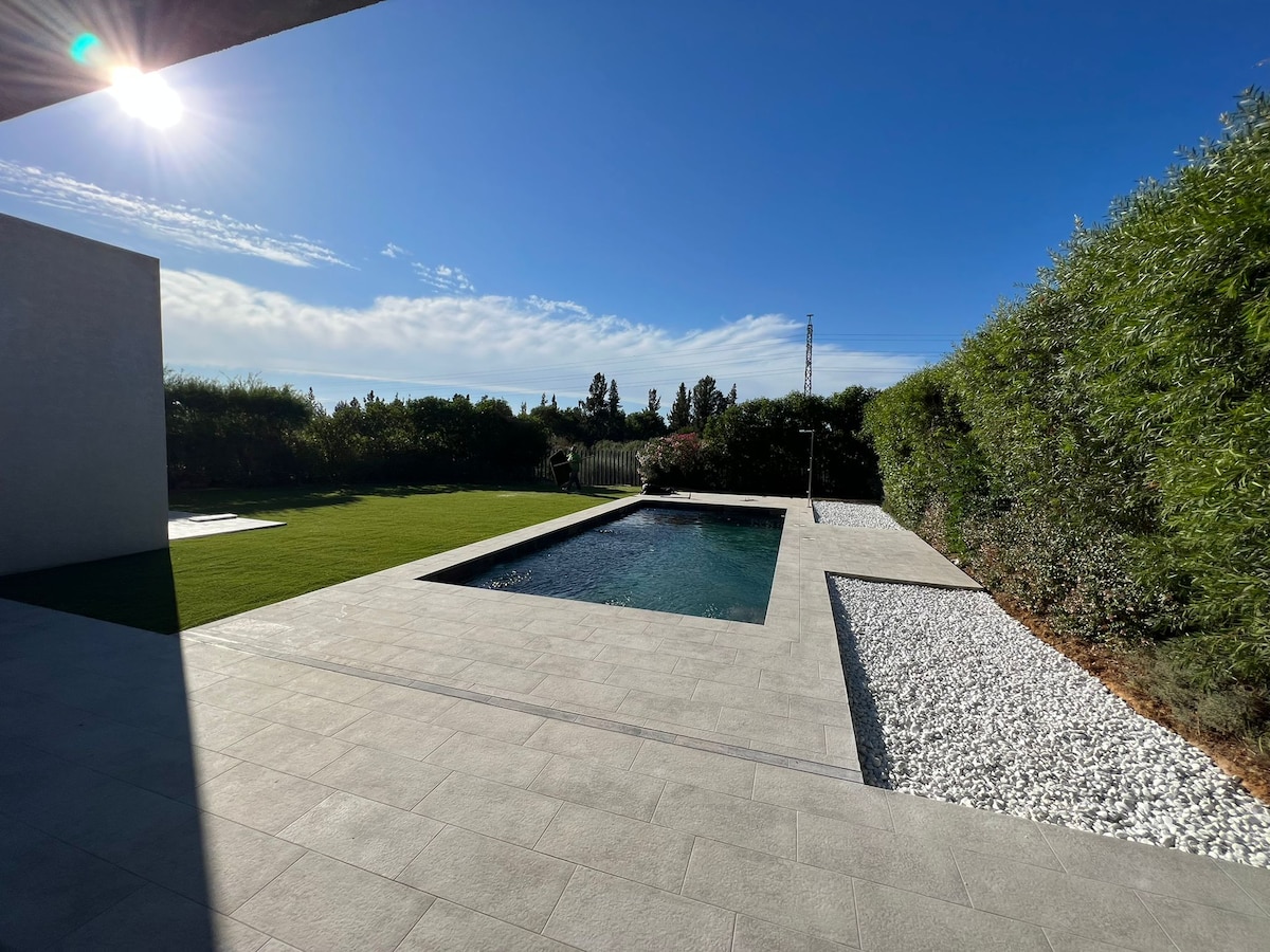 Big ventilators recently installed in the roof of each bedroom and in the living room! Villa in exclusive area of 22 independent villas, pool and private parking, 400 meters from the beach,nearer to the golf course. A lounge, four bedrooms (each having a ventilator in the roof, as well as in the living room), two bathrooms, fully equipped kitchen, open rooftop, common swimming pool private garden and BBQ. Wifi recently installed