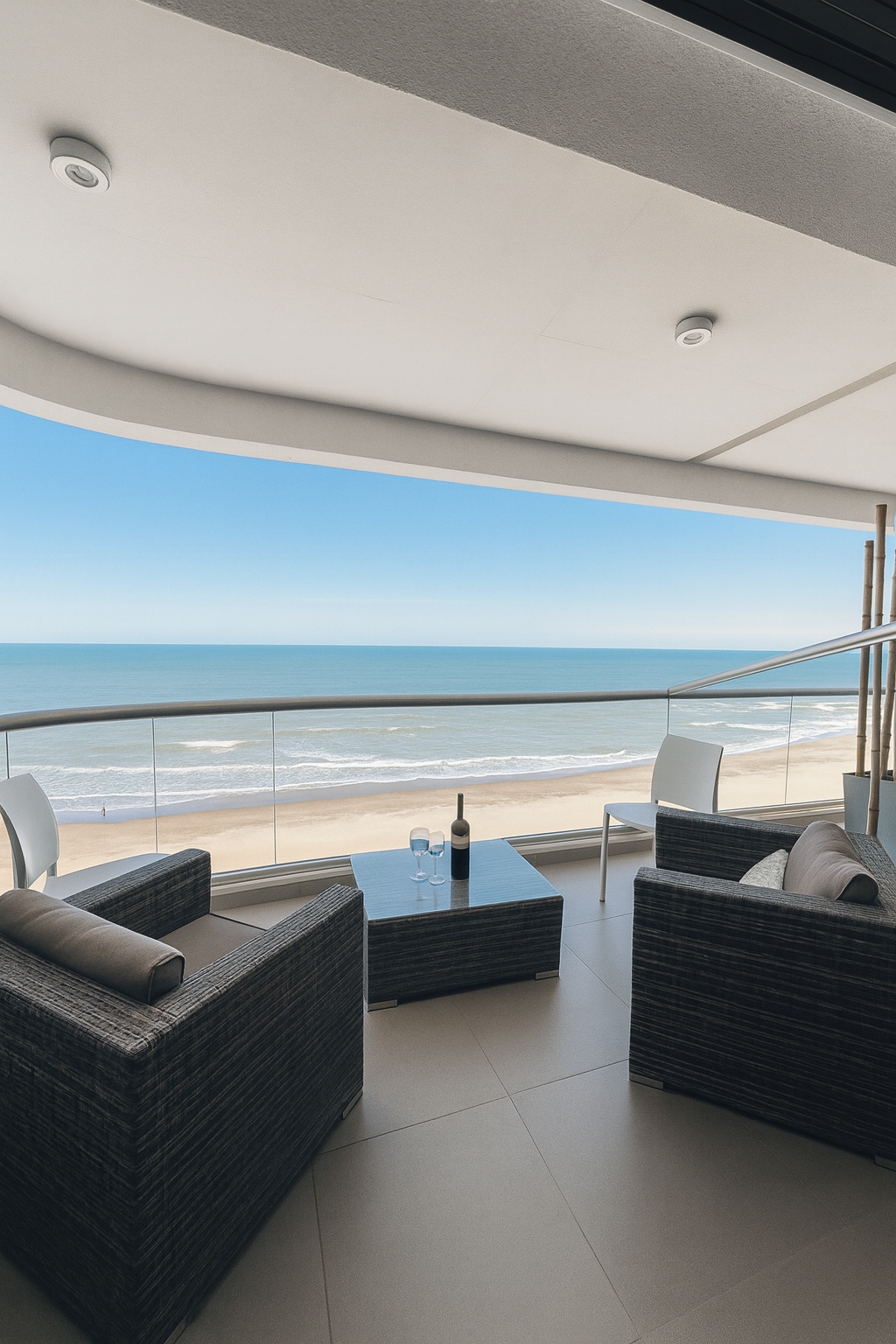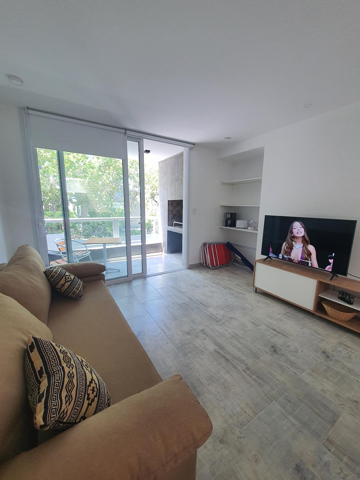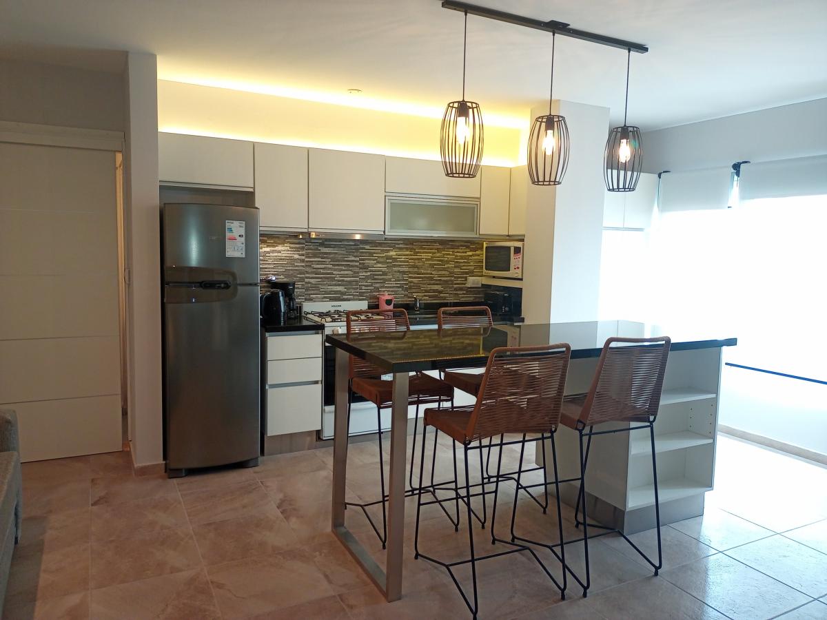 Departamento nuevo. Estilo y confort, para disfrutar amaneceres y atardeceres. Living comedor con isla y mesa de madera, 8 sillas con funda de tela y sillones. Vista panoramica al mar y la naturaleza. Cocina con equipamiento para una estadia como en casa. Dormitorio principal con amplio placard, sommier King Koil de 1,8M, sabanas de algodon marca Foyer, almohadas simil duvet, edredon y cover de percal. TV 50", AA, blackout y roller screen. Y cuenta con baño en suite.