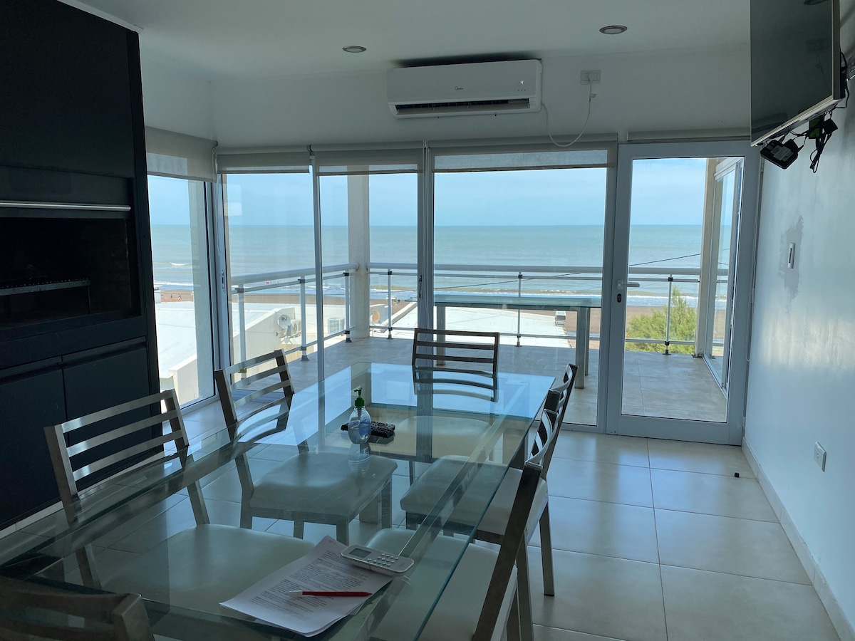 Frente al mar con excelente vista a la playa y al mar. Living comedor con parrilla,tv con cable,aire acondicionado, muy cálido ambientado, con muebles de muy buena calidad. Dos dormitorios, uno con somier de 2 plazas y otro dormitorio, con 3 camas bajas y una en altura,con tv led. 2 baños de los cuales uno es completo con bañadera. Balcón y cochera. No incluye ropa blanca (sabanas y toallas).