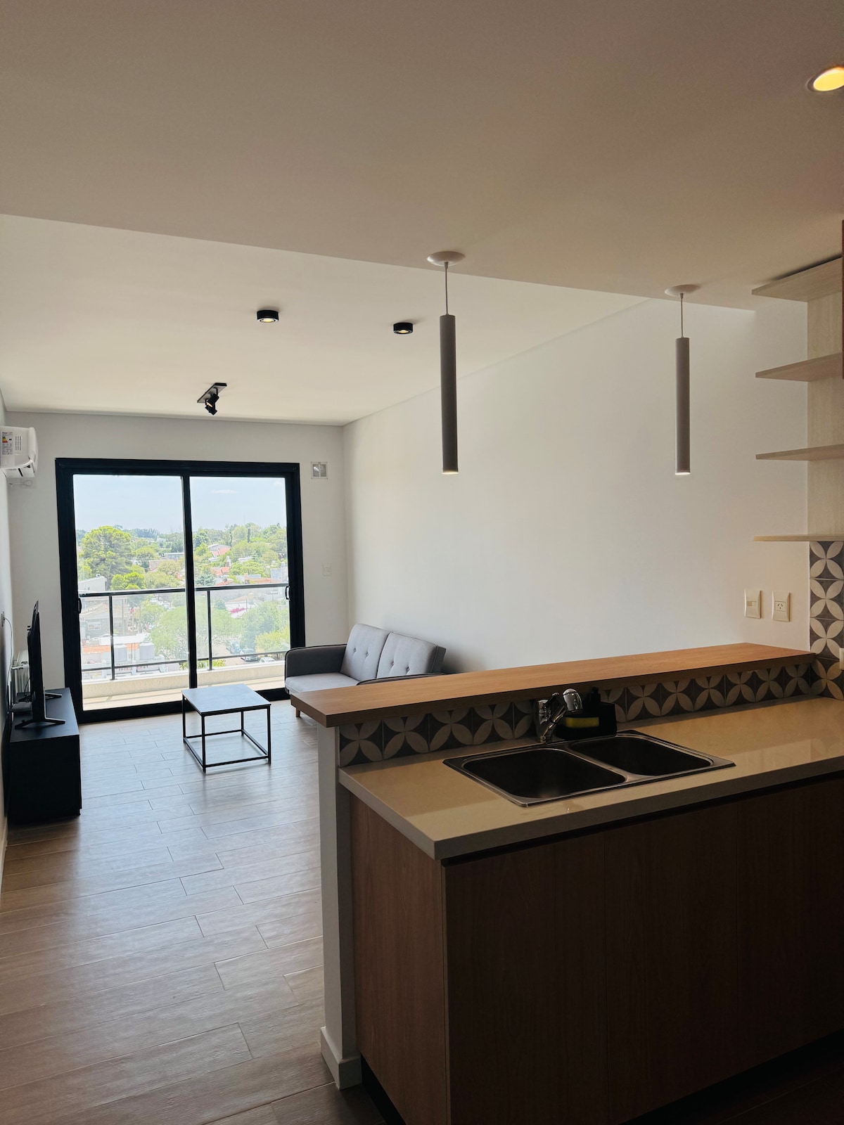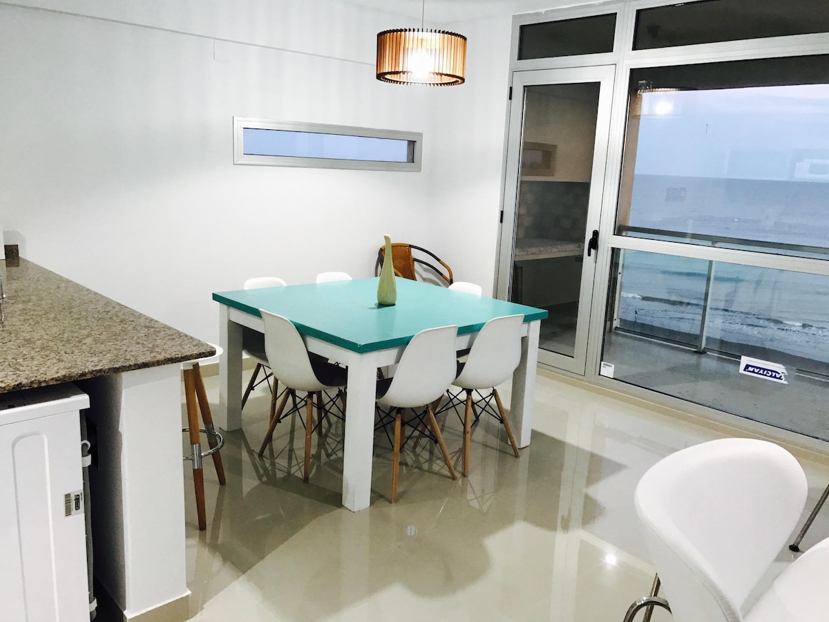 Departamento nuevo. Estilo y confort, para disfrutar amaneceres y atardeceres. Living comedor con isla y mesa de madera, 8 sillas con funda de tela y sillones. Vista panoramica al mar y la naturaleza. Cocina con equipamiento para una estadia como en casa. Dormitorio principal con amplio placard, sommier King Koil de 1,8M, sabanas de algodon marca Foyer, almohadas simil duvet, edredon y cover de percal. TV 50", AA, blackout y roller screen. Y cuenta con baño en suite.