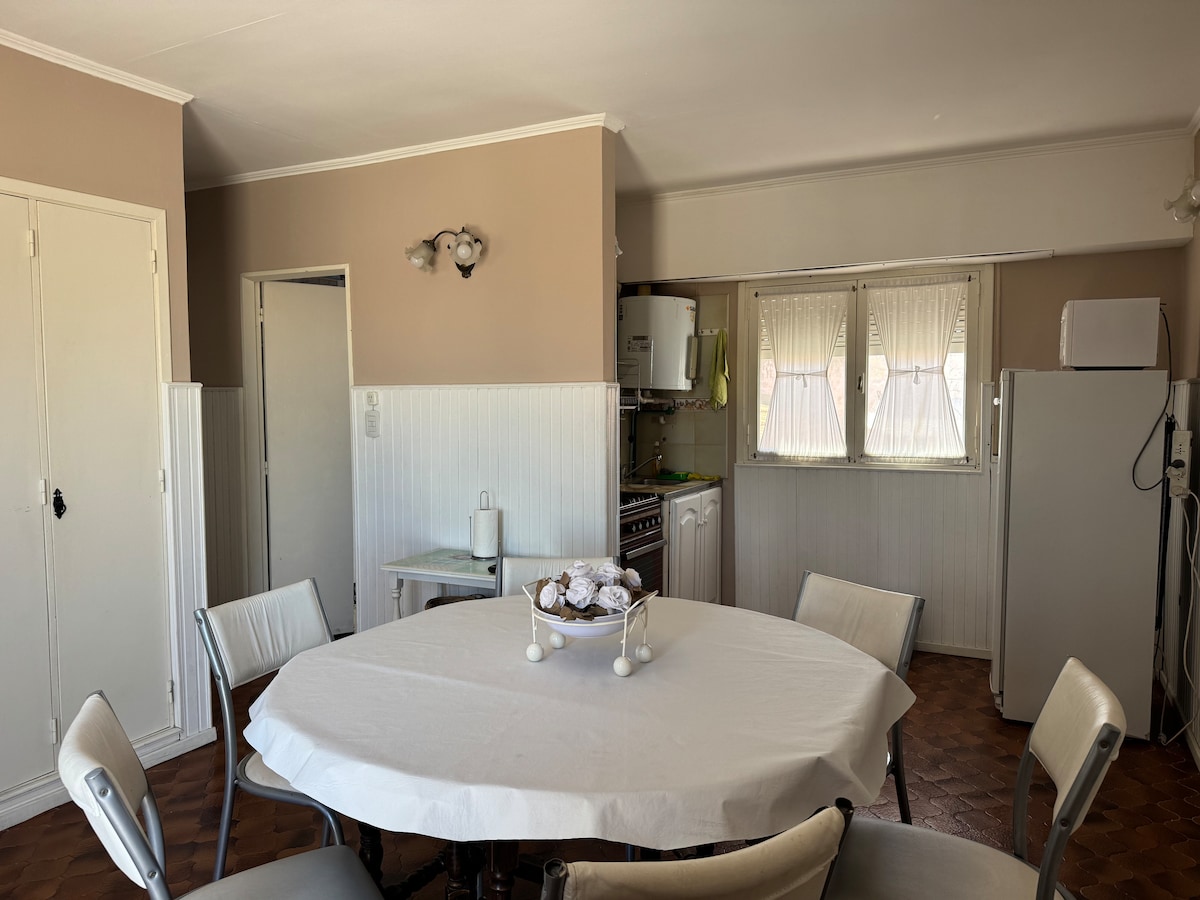 Relajate con toda la familia en este tranquilo alojamiento. Tenemos Direc Tv. Internet. En la habitacion principal hay aire acondicionado. Amamos a las mascotas, son siempre bienvenidas. Tenemos una hermosa parrilla para disfrutar ricos asados al aire libre, en un hermoso jardin. Estamos en una zona muy tranquila a 9 cuadras de la playa y a 7 del centro. Tenemos lavarropas, horno electrico, cocina, heladera. El baño tiene bidet. Se pueden guardar hasta dos vehiculos.