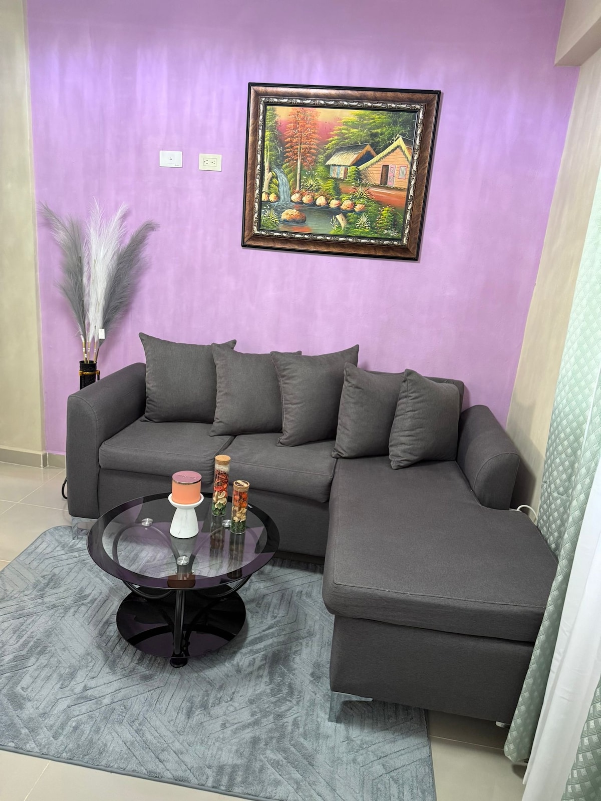 Luxury apartment in the heart of villa Altagracia, located in the KM 43, convenient access to both highways, grocery, shopping, convenience stores, bus, amazing mountain to explore, river and countryside. Just 45 minutes from Santo Domingo and an hour from Santiago, private access to this place, garage available, AC in the main room & living room as well, 2 sofas beds , beautiful views from the balcony, Hot water, WiFi, proyector in the living room to make your gathering experience special.