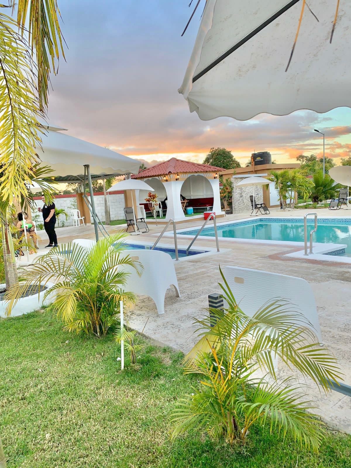 Un hermoso lugar para relájate con toda la familia , aqui encontraras una tranquilidad unica. Hubicada en yamasa, con hermosos arboles , animales y piscina , 6 habitaciones ,2 cocinas completa en el interior y exterior , 5 baños , BBQ a gas y carbón , cocina leña, caja china ,Gasebo y billar. Contamos con unTiki bar , en el cual tenemos ventas de bebidas ( cervezas , refrescos , ron , whisky y demás . Opcional Ofrecemos servicio de bufet y de decoración para sus eventos .
