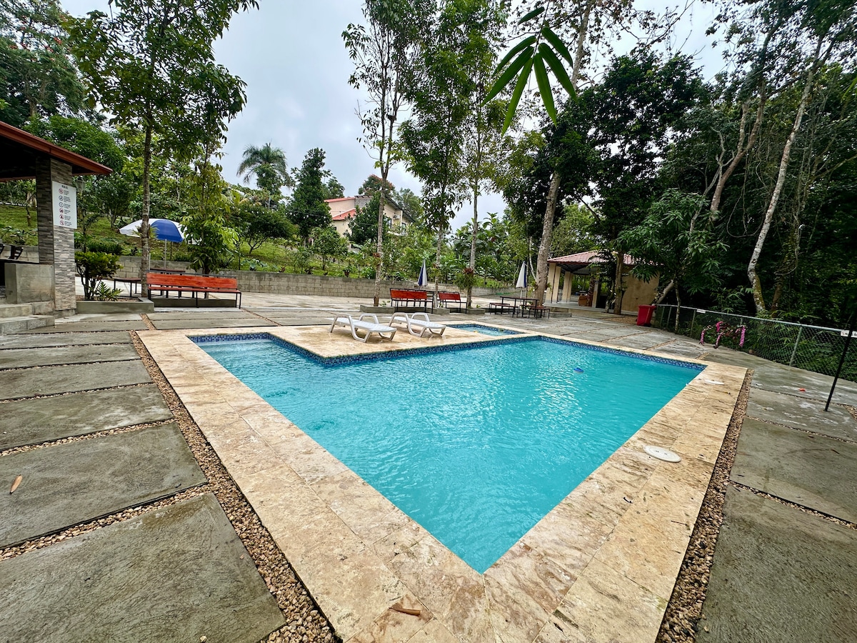Lleva a toda la familia a este alegre alojamiento que tiene un montón de espacio para divertirse. Puedes disfrutar de una maravillosa piscina, así como de un hermoso río dentro de la misma propiedad, y como si fuera poco, tendrás servicio doméstico durante ocho horas al día para preparación de desayunos y almuerzo, si lo solicita por un precio adicional. Es ideal para celebraciones de bodas y pasadías. También para retiros espirituales.