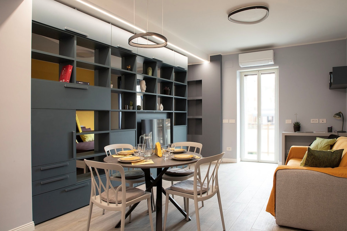 Un loft dallo stile stile moderno ed essenziale. La cucina a vista completamente attrezzata si fonde con il soggiorno, completo di una comoda zona smart working e di un divano letto. La porta finestra conduce al balcone, mentre un pratico ripostiglio ospita la lavatrice, l'asciugatrice e gli utensili per la pulizia. La libreria dotata di tv girevole separa il living dalla camera matrimoniale elegante e confortevole. Completa il loft il bagno dal design raffinato.