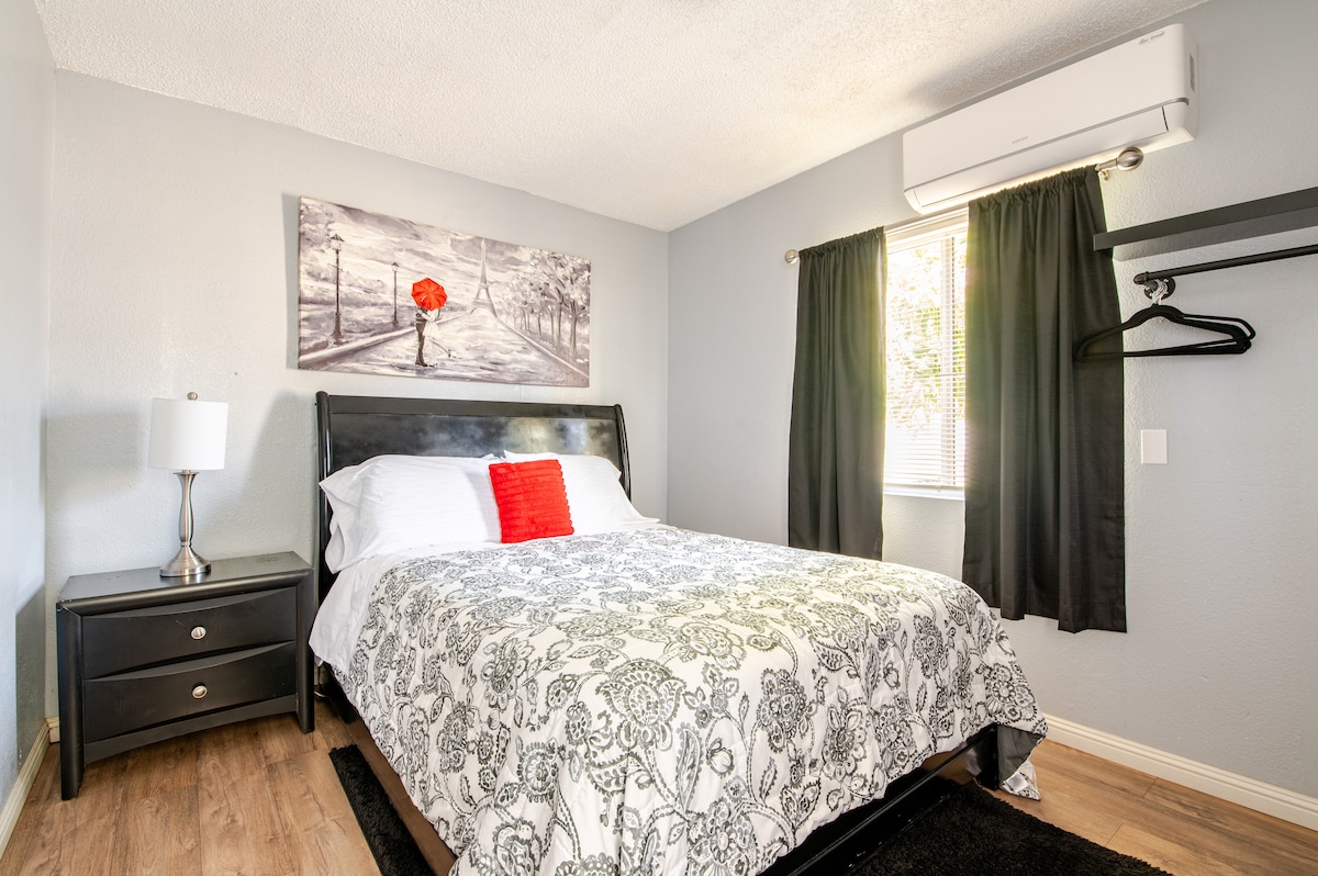 Quiet and cozy standalone guesthouse with private entrance and self check-in. No contact with other guests, no spaces are shared — everything is entirely for your private use. Features a queen-size bed ideal for couples, an additional sofa bed can be provided for the third guest to sleep on. A/C and heating, work desk, fan, and smoke detector. Enjoy a private kitchen for light cooking, a walk-in shower, and blackout curtains for restful sleep. Large windows provide plenty of natural light.