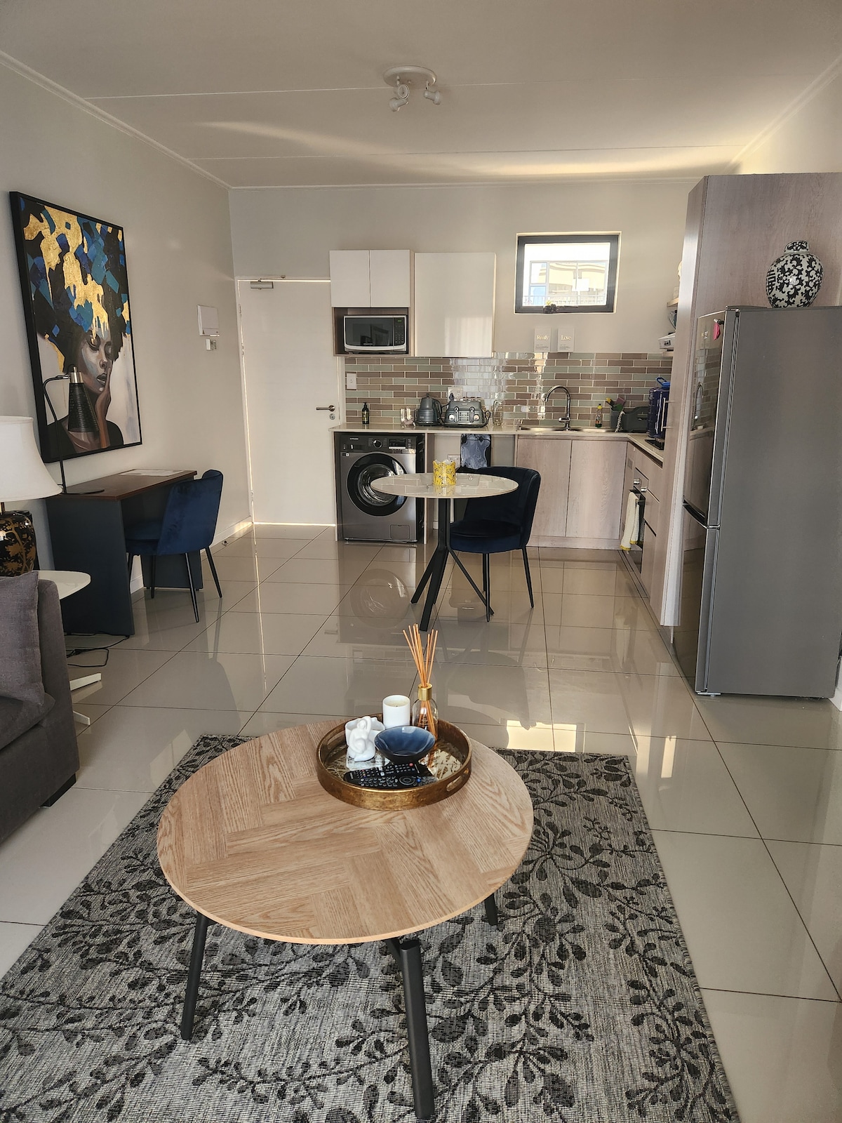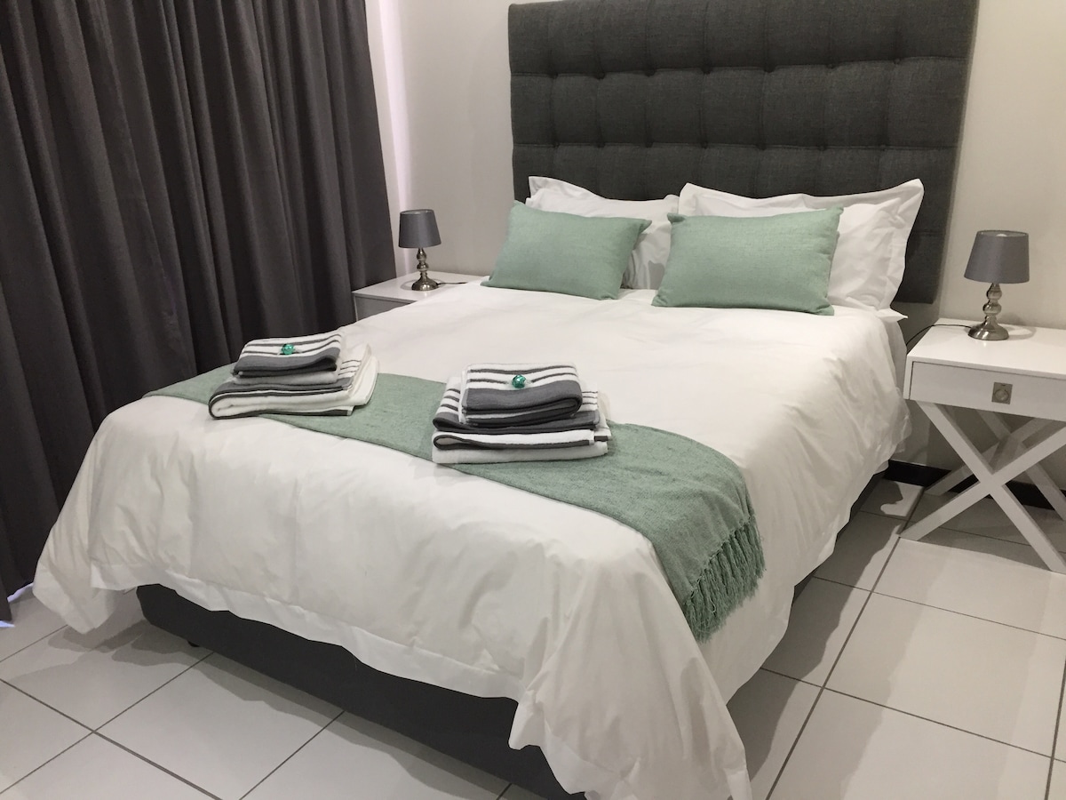 We welcome you to relax in our calm and luxurious space situated in a quiet section of Fourways. The apartment is uniquely and tastefully designed with amenities that radiate style and comfort. Treat yourself to this stunning apartment with a queen size bed, a fully equipped kitchen and a modern bathroom. Unwind on the patio or on the couch and enjoy a TV with Netflix and Youtube. The apartment has electricity backup that runs the TV and the Wi-Fi. Book your stay today and indulge in luxury.