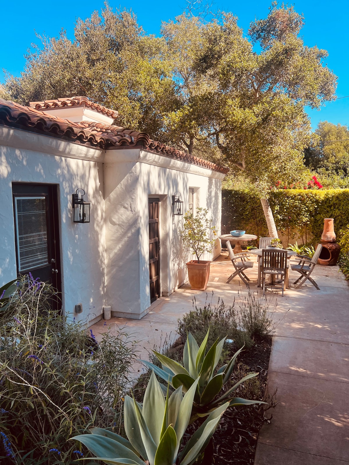 Our detached Spanish-style artist’s studio is within a 3 to 15 minute walk of all the best restaurants and shops in the lower Village of Montecito. It is an easy four block walk from the patio to beautiful Butterfly Beach. It is cozy, private and has a fabulous, hot, outside shower ! (Note; this shower is the only shower for the studio). Gaze at the stars while rinsing off the sand ! The studio space is small, and cozy, warm radiant concrete floors can be turned on in the chillier months.
