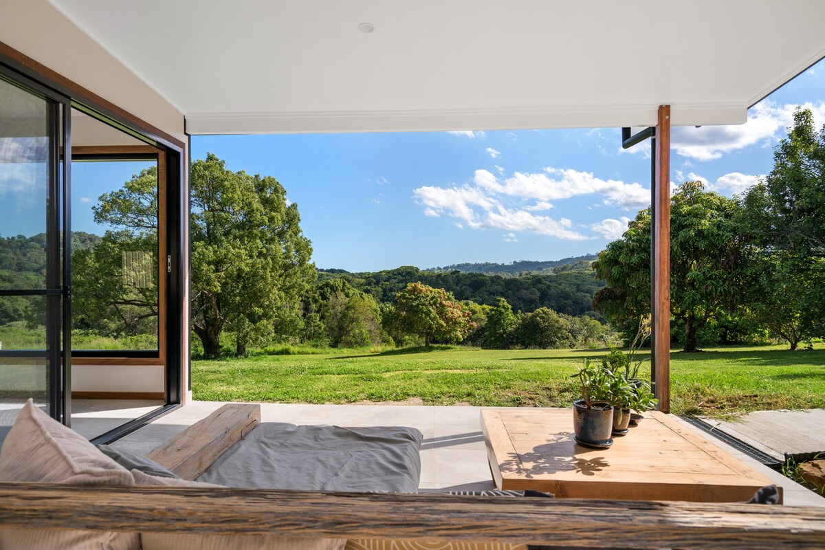 Breathtaking 270 degree distant views from sunrise to sunset. A newly built, self-contained eco villa, on a working cattle farm, providing stunning vistas of Byron Bay Hinterland from your bed! Natural lime-rendered hempcrete walls, rustic hardwood beams, & timber floors. Open plan with floor-to-ceiling glass. French doors in the bedroom open to the claw foot bath on the deck. Easy driving distance from Mullumbimby, Byron Bay, Brunswick Heads, Ballina airport and Coolangatta / Gold Coast.
