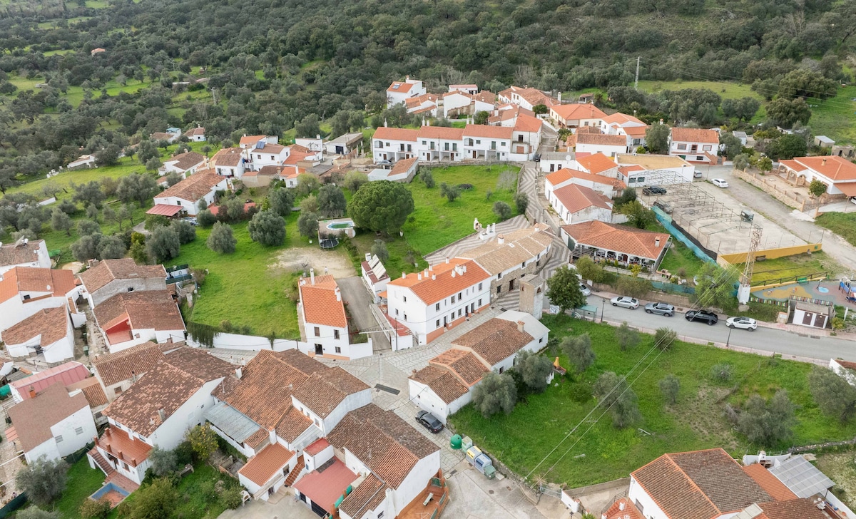 Bicentenary stone house in a secluded village between Aracena and Riotinto. Enjoy a barbecue with valley views, cozy fireplace, patio with loungers, and unforgettable sunsets. Silence, nature, and starry skies, with fast satellite internet for remote work, video calls, or streaming. Perfect for unwinding, reading, walking, or simply letting time stand still.