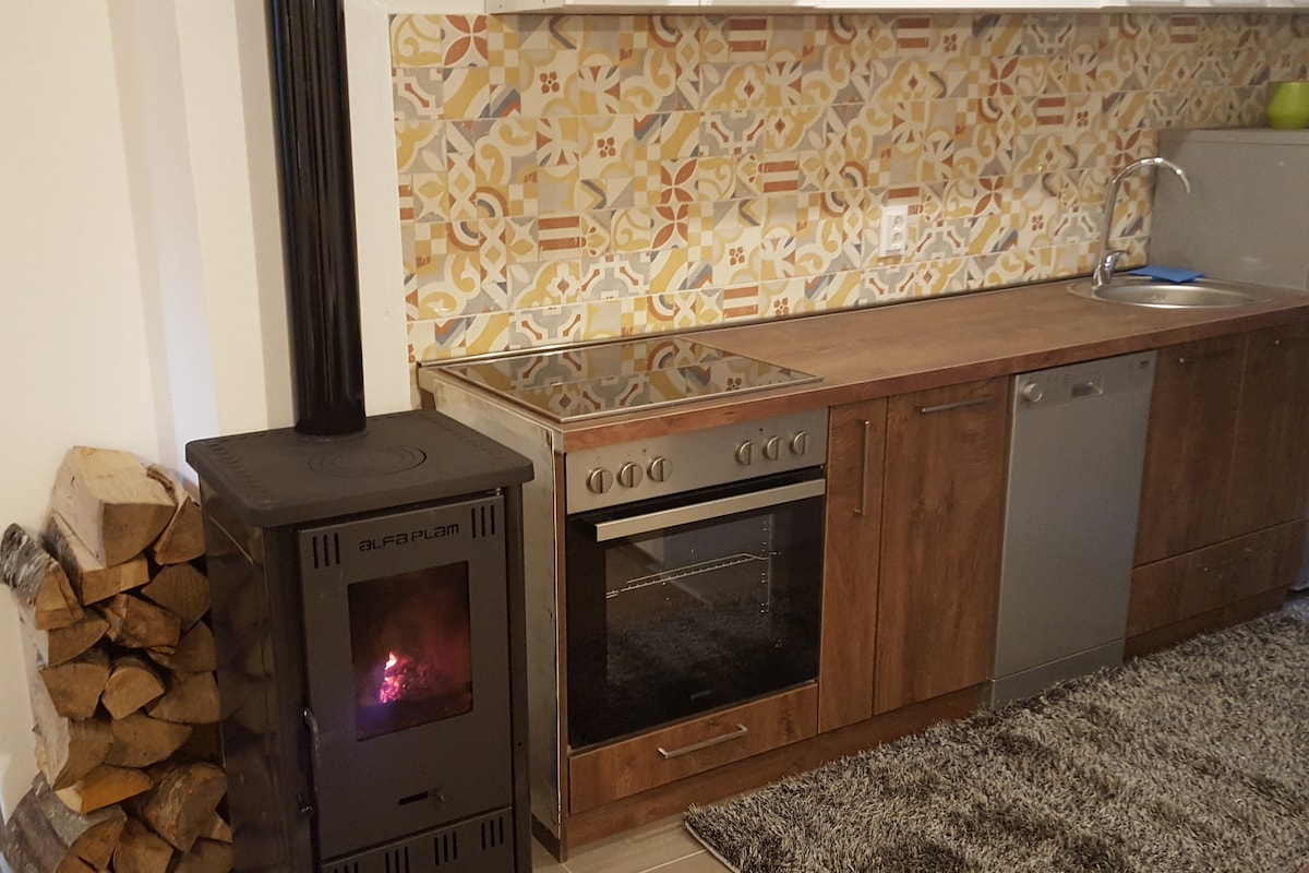 It's new studio apartment with wood & stone details. It has space for sleeping (double-bed), kitchen, space for eating, bathroom. It's far from city center 3 minutes by foot. Apartment is on ground floor of the house. Also guests have its private entrance and parking. It's set in quiet part of town.