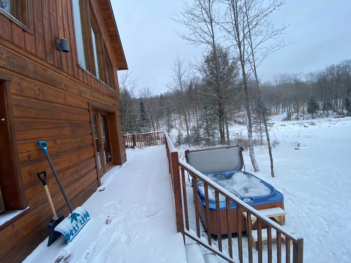 Welcome to Meraki Chalet, your riverside escape in Val-Morin, just an hour from Montreal. Winter here means soaking in the big covered 9-seat hot tub, gathering around the fire pit, or snowshoeing our private 500m forest trail. Want to ski? Belle Neige and Mont Saint-Sauveur are just minutes away. With 4 bedrooms, lots of living space, and room for up to 14, the chalet is made for families and friends who want comfort, fun, and a cozy Laurentian getaway.