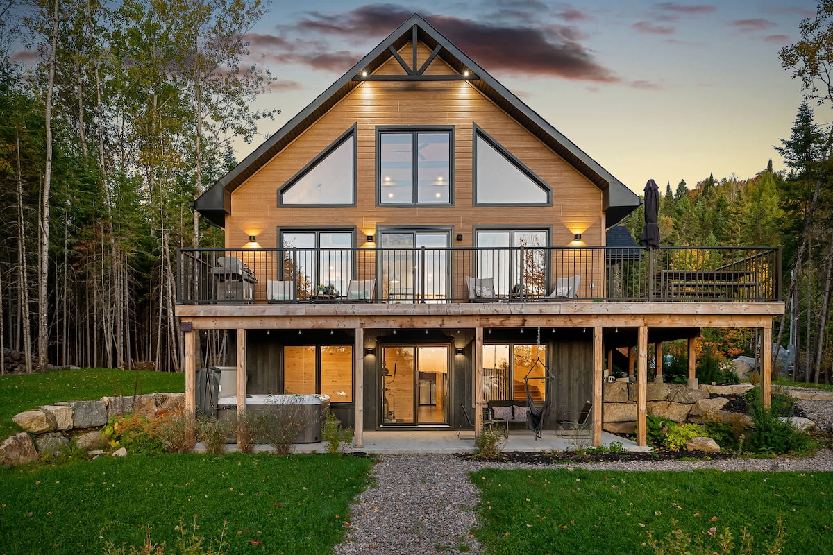 Chalet design au bord d’une rivière paisible, tubes de neige pour glisser,magnifique vue sur la montagne. À15 min du Spa La Source, du ski montcalm, de la tournées des cantons 🎿🥾 et d’Arbraska Rawdon. Idéal pour deux familles avec étages séparés. MAX 6 adultes, Parfait pour jeunes enfants (bien équipé). Très grand terrain intime, foyer intérieur/extérieur, hamac intérieur suspendu, tubes de neige, cinéma 🏠. Endroit calme (un seul voisin) avec Wi-Fii. Soucis du détails