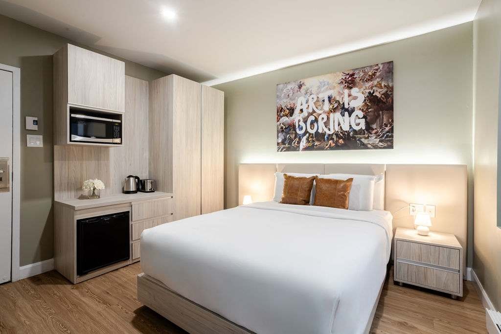 This elegant hotel room blends style and comfort, featuring a plush queen bed with premium linens. Located in one of Montreal’s most vibrant neighborhoods, you’re steps from cafés, bars, and cultural gems. Guests also enjoy access to a welcoming lobby lounge and a spacious basement with cozy seating, a pool table, and big-screen TV—perfect for work or relaxation.