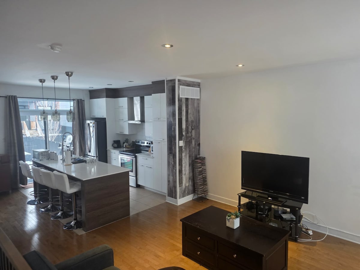 UPDATED 2024! This warm modern corner unit townhouse is perfect for your family Or professional. Furnished with High end furniture, blackout blinds, dimmers on all the lights and a fully functional kitchen with all cooking tools needed to make a great meal. Close to all amenities and 15 min from downtown Montreal. Backyard to a bike path and views of the the Saint-Laurence river.