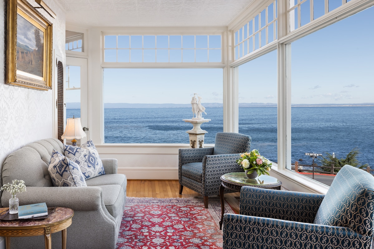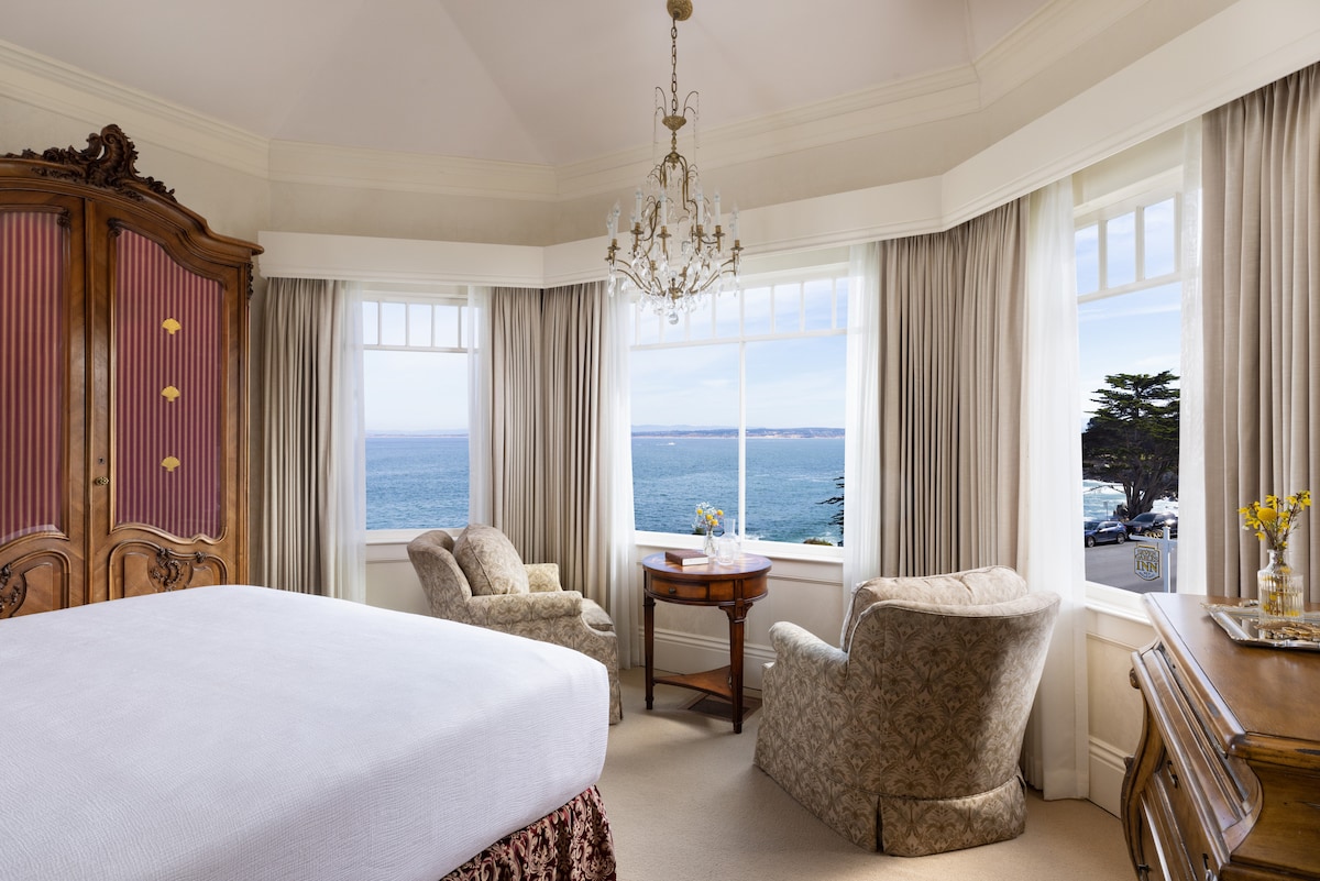 The Lover's Point Room, accented in deep burgundy, gold, emerald green, and soft beige, has a direct ocean view looking at its namesake, Lover's Point, and wonderful afternoon light displayed through the floor-to-ceiling, 3-foot wide by 5-foot tall window! • Rooms are sanitized following the Clean+Safe protocol outlined by Calif Lodging Assoc. Due to COVID-19 there is NO interim maid service. • Complimentary breakfast. • Lots of restaurants very close to Inn.