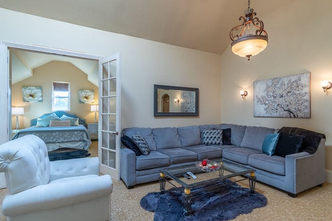 Experience the entire top floor of Chateau Coralini in this dreamy Penthouse King Suite with a private living room, soaking tub, gorgeous views, and exclusive amenities. Enjoy a romantic canopy bed, a cozy window nook overlooking the fountains and Salinas city lights, and the comfort of heating and cooling. Perfect for romantic getaways, long weekends, and guests seeking a spacious, private, and unforgettable stay near Monterey and Carmel.