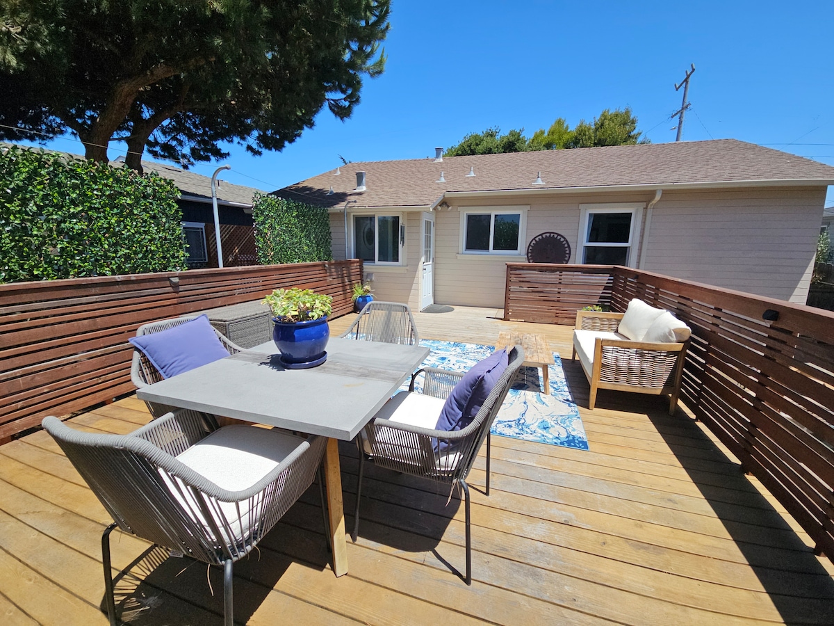 Enjoy a stylish experience at this centrally-located place. Our home is located in a prime location, just minutes away from The Beach, Monterey Bay Aquarium, Carmel, and down town! Enjoy a well thought out floor plan with modern & comfortable fully furnished home. Want to cook a family meal? Use our fully stocked kitchen to whip out some amazing meal for the full family! And see the ocean from some of our windows on the 2nd floor!