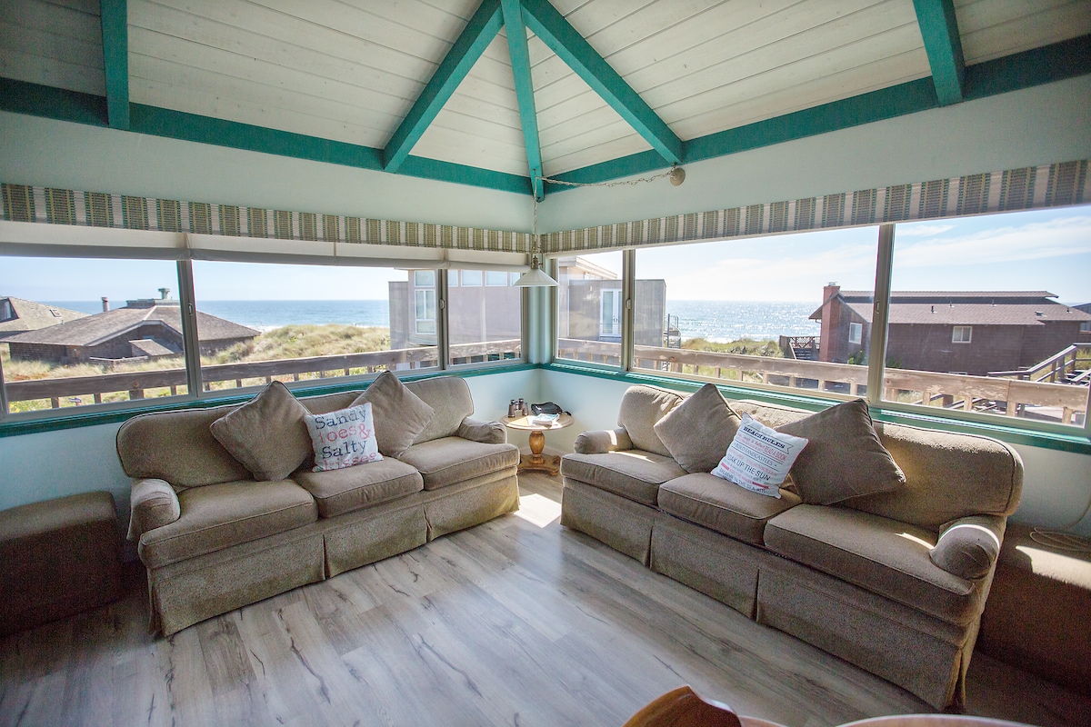 Beachfront & oceanfront condo in gated Shorebirds Resort! Just steps to feel the sand between your toes. Remodeled 2BR/2BA (sleeps 6) with epic sunsets and ocean views. Hear waves from the bedroom or living room, and watch dolphins, otters & whales from the 2nd floor. Comfort + miles of unspoiled beach await.