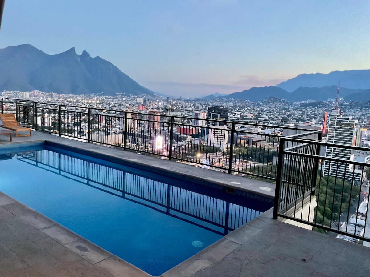 ¡Bienvenido a Puntacero! Esperamos recibirte en uno de nuestros Airbnb más lujosos de Monterrey. Departamento con acabado excepcional y vista al cerro de la silla. ¡Ubicación única! Wifi, Smart TV, climatizado, 1 cajón de estacionamiento. Ideal para ejecutivos, familias y turistas. Seguridad 24/7, 3 elevadores, EXCELENTES AMENIDADES. Plaza comercial con restaurantes y un OXXO cerca.
