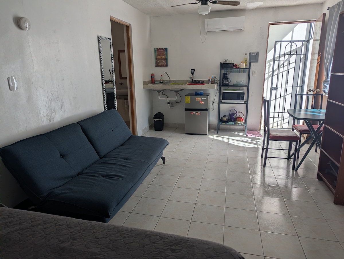 Departamento en segunda planta, con entrada independiente, baño privado y cocineta. Cuenta con frigobar, comedor, 1 cama matrimonial, mini closet y aire acondicionado frió y calor. Con cafetera, microondas, plancha y secadora de pelo, utensilios de cocina, vajilla y blancos. Preparado para 3 personas. Seven Eleven a 50 metros, Universidad Mederos a 2 kms, Walmart las Torres a 2 kms, ITESM a 7kms, estacionamiento disponible alrededor de la cuadra.