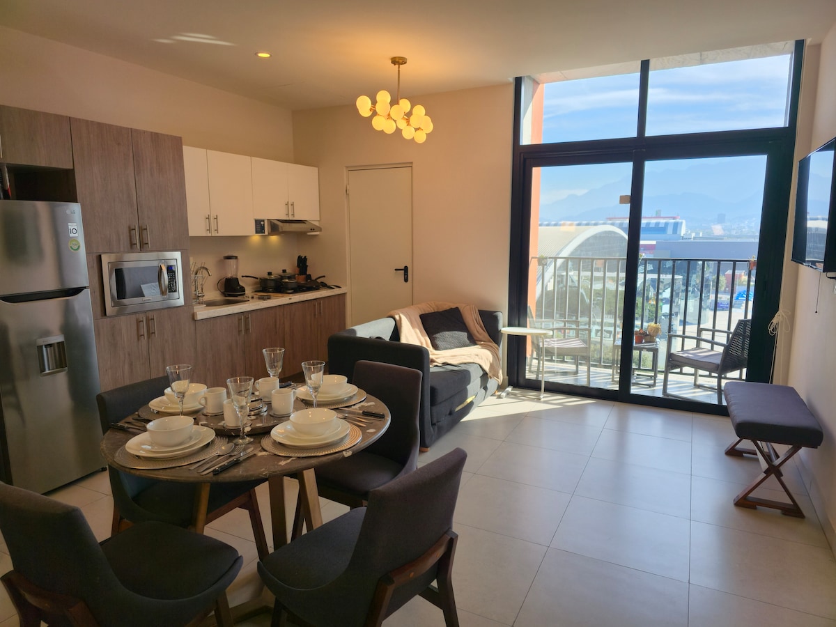 Precioso departamento totalmente remodelado en la mejor zona de san Pedro Garza García. Prácticamente todo nuevo (camas, sábanas, colchones, persianas, refri, lavadora, secadora, sala, comedor, electrodomésticos, climas). Cuenta con Wifi, smart TV con 80 canales, minisplit en cada cuarto y un lindo balcón con hermosa vista a la zona hotelera.