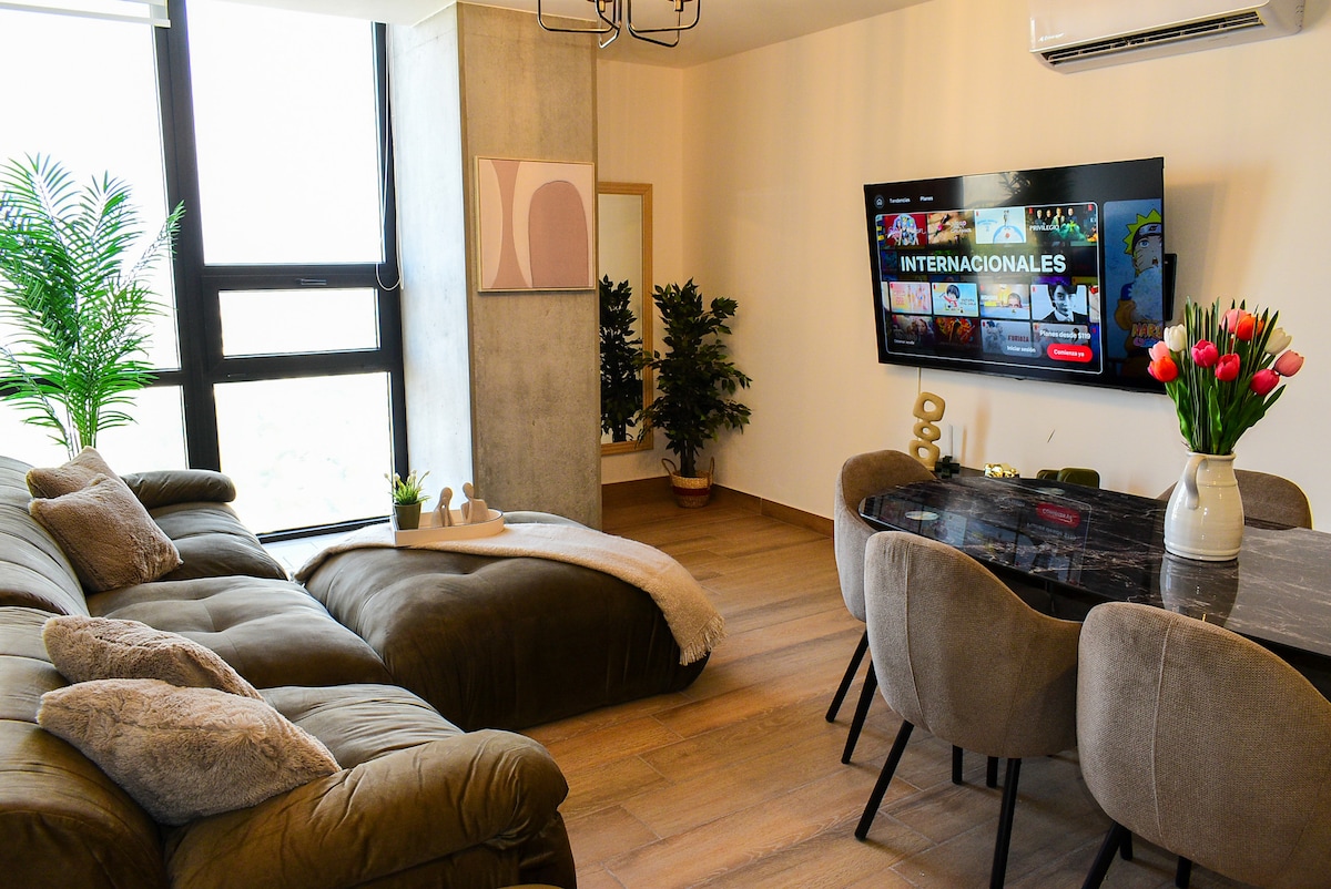 Espacioso, moderno y equipado loft ubicado en el corazón de Monterrey. 🍽️ ☕️ - Cocina equipada con sartenes, ollas, air fryer, cafetera (café americano, descafeinado y te), utensilios de cocina, etc. 🛏️ - Cama Queen size, sabanas y ropa de cama limpias 🛋️ - Cómodo Sofa Cama ❄️ Mini Split con AC y Calefacción 📺 - TV de 50”, Netflix, Prime, HBO y Cable 🛁 - Baño completo, toallas limpias, secadora y artículos de aseo personal 👨💻 - Espacio de trabajo con escritorio y Alexa 🏪 - OXXO ✔️Múltiples amenidades