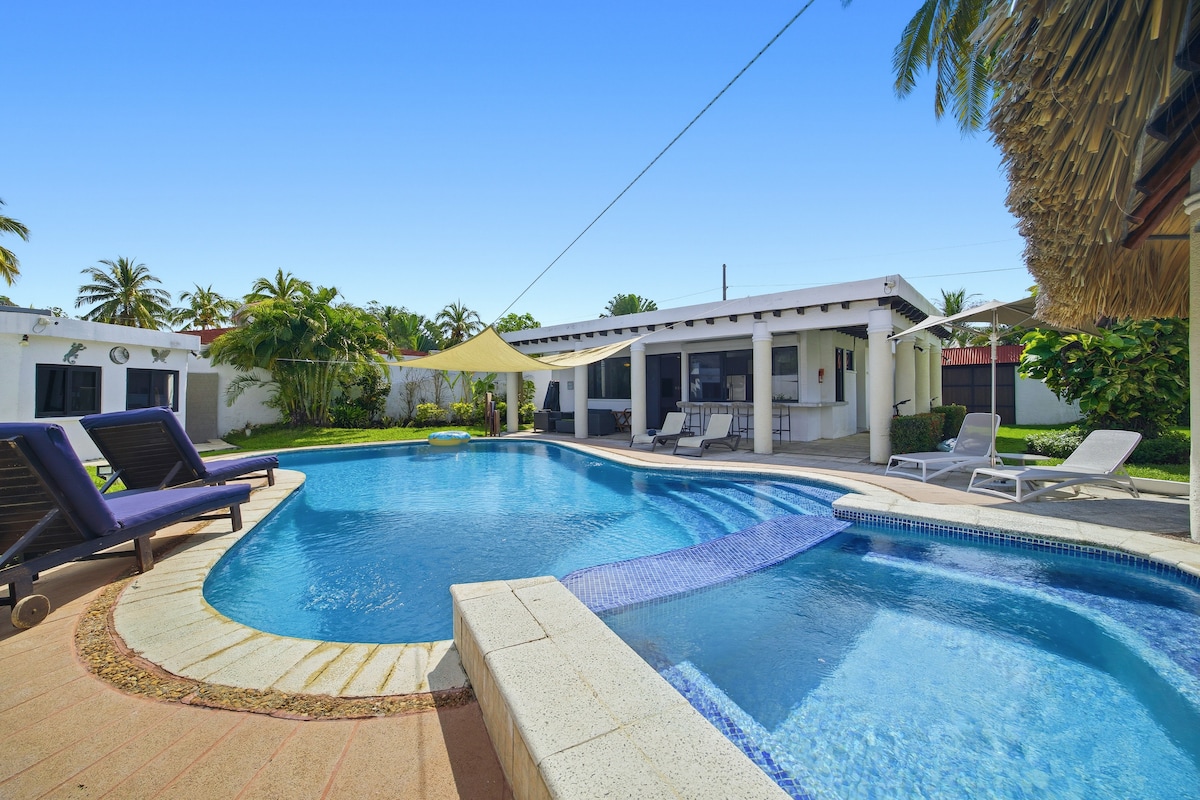 Casa de Playa frente al Mar, completamente privada. La casa cuenta con agua dulce se hizo cisterna para el efecto, y la piscina es de agua salada. Cocina completamente equipada con A/C. Dos habitaciones con A/C y baño privado cada una. Rancho de descanso con hamacas, salida peatonal a la playa, ideal para descansar, acompañado de amigos y familiares, Tranquilo y acogedor. Pensado para la privacidad de nuestros huéspedes. 3 parqueos privados adentro de la propiedad.