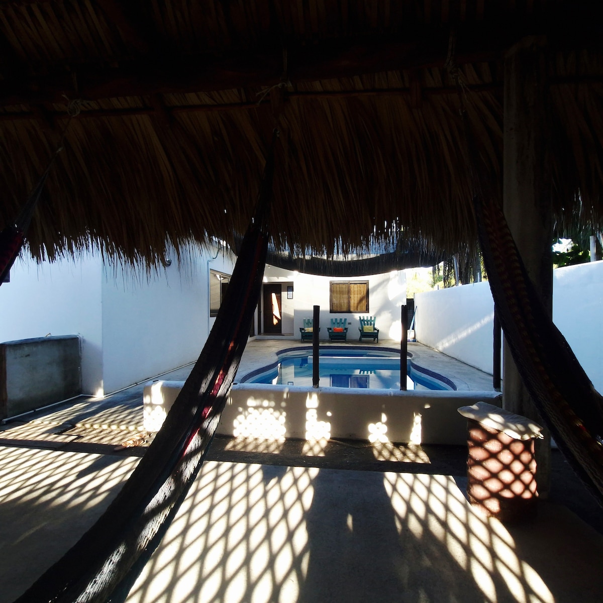 Minimalistic rancho house (not luxury) with pool & kitchenete & lots of natural light, comfy queen bed, large comfy living area serving as a 2nd bedroom, open air bathroom, nice little pool with comfy lounging area! 1.5 blocks from the beach in probably the best central location within the hotel & bar scene, but secluded to have a chill time. "Check in 14.00/ Check out 11.00