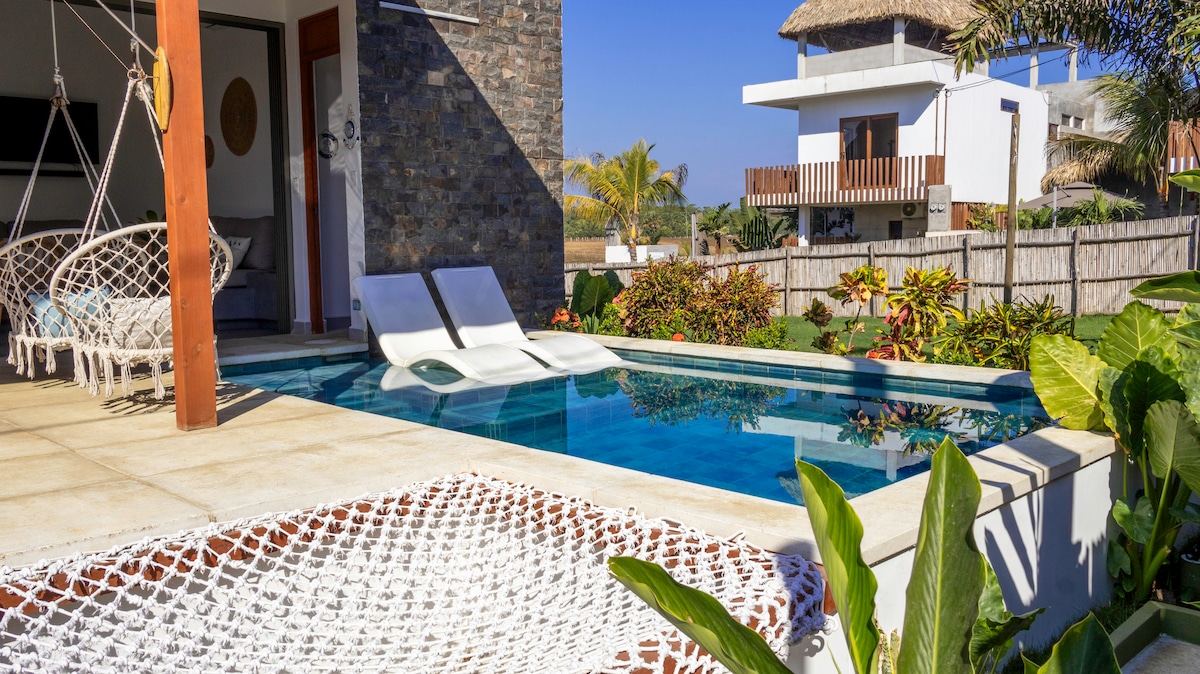 Aranxä: a refuge inspired by the orange sunsets of El Paredón. The house is situated facing the sea, and from every room, you will have a view of the Pacific Ocean; it is paradise for those looking to disconnect and relax. Its design is spacious, inspired by Indonesian architecture. It includes a cook and concierge, with a menu of local food offered. Bungalows with private bathrooms and luxury finishes. The pool and terrace also have a view of the sea and the best sunsets.