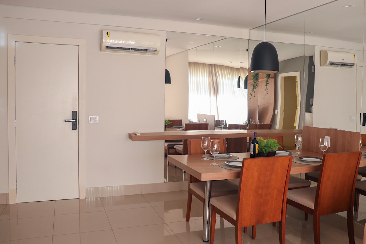 O apartamento é muito confortável, arejado e limpo. Possui um quarto para casal com ar condicionado e um quarto/escritório com duas camas solteiro, mesa e cadeira agradável para trabalhar/estudar. O apê é muito bem localizado, perto de hospitais, academia, supermercado. E também da avenida mais famosa de Montes Claros com diversos bares, restaurantes, sorveteria, pizzaria, churrascaria etc. Obs.: A garagem é coberta e acomoda veículos de pequeno e médio porte. Caminhonetes não cabem.