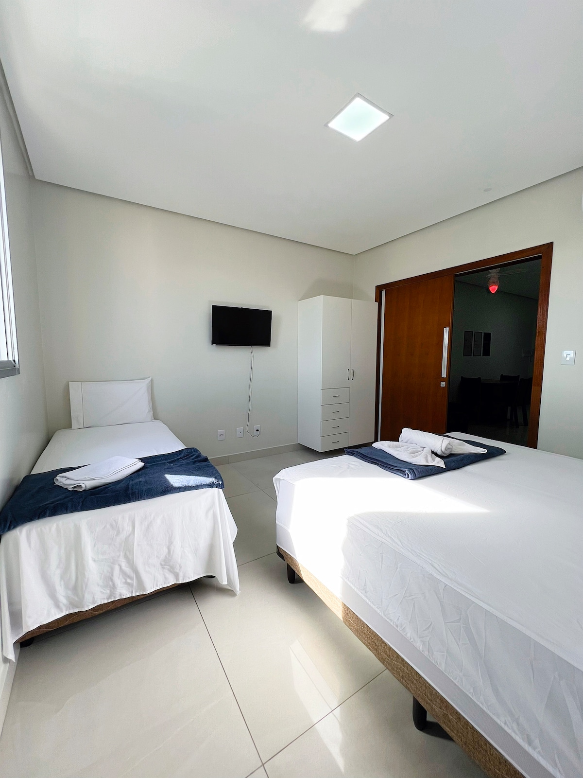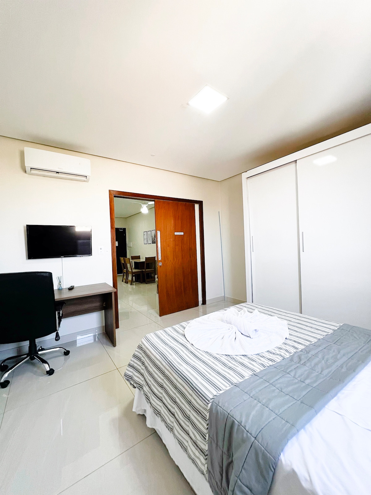Conforto e praticidade Apartamento moderno, equipado com ar-condicionado, cama king-size e sofá com TV. Cozinha completa com sanduicheira, microondas, liquidificador e utensílios essenciais. Localização privilegiada: 700 m da Santa Casa e 300 m da Avenida Sanitária, próximo a restaurantes, farmácias, bares e lanchonetes. Condomínio seguro com portaria remota 24h e vaga de garagem para carro.