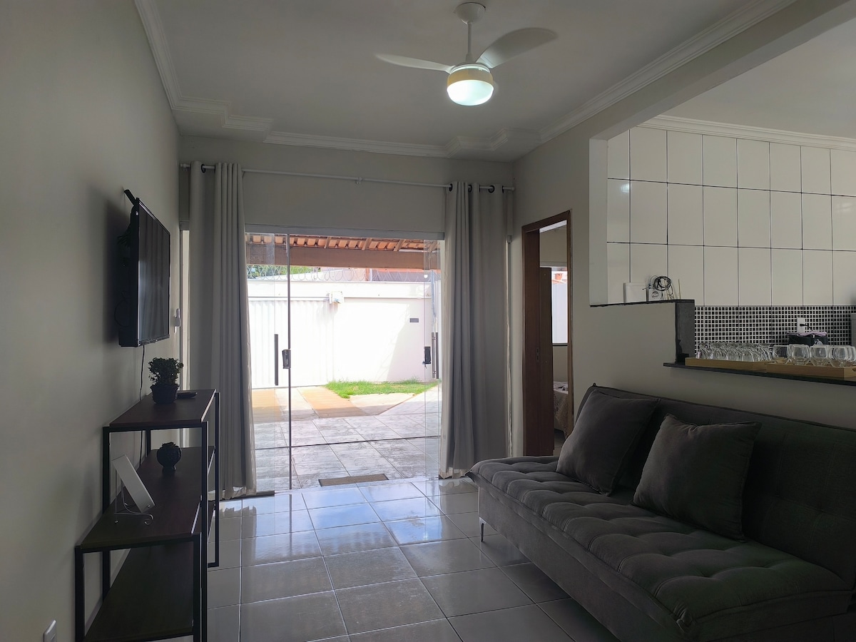 Localizada à 5 minutos do centro e com saída rápida para diversos pontos da cidade, a rua é sem saída, segura e calma, você poderá dormir em paz sem o barulho do trânsito. 2 quartos sendo um com ar condicionado, 2 camas Queen, tudo novinho e bem cuidado. Equipada do que é necessário para passar dias confortável. Tv (com Netflix e Globoplay), microondas, cafeteria, misteira, air fryer, máquina de lavar roupa… O dono mora em uma casa em frente, estando próximo para em caso de alguma emergência