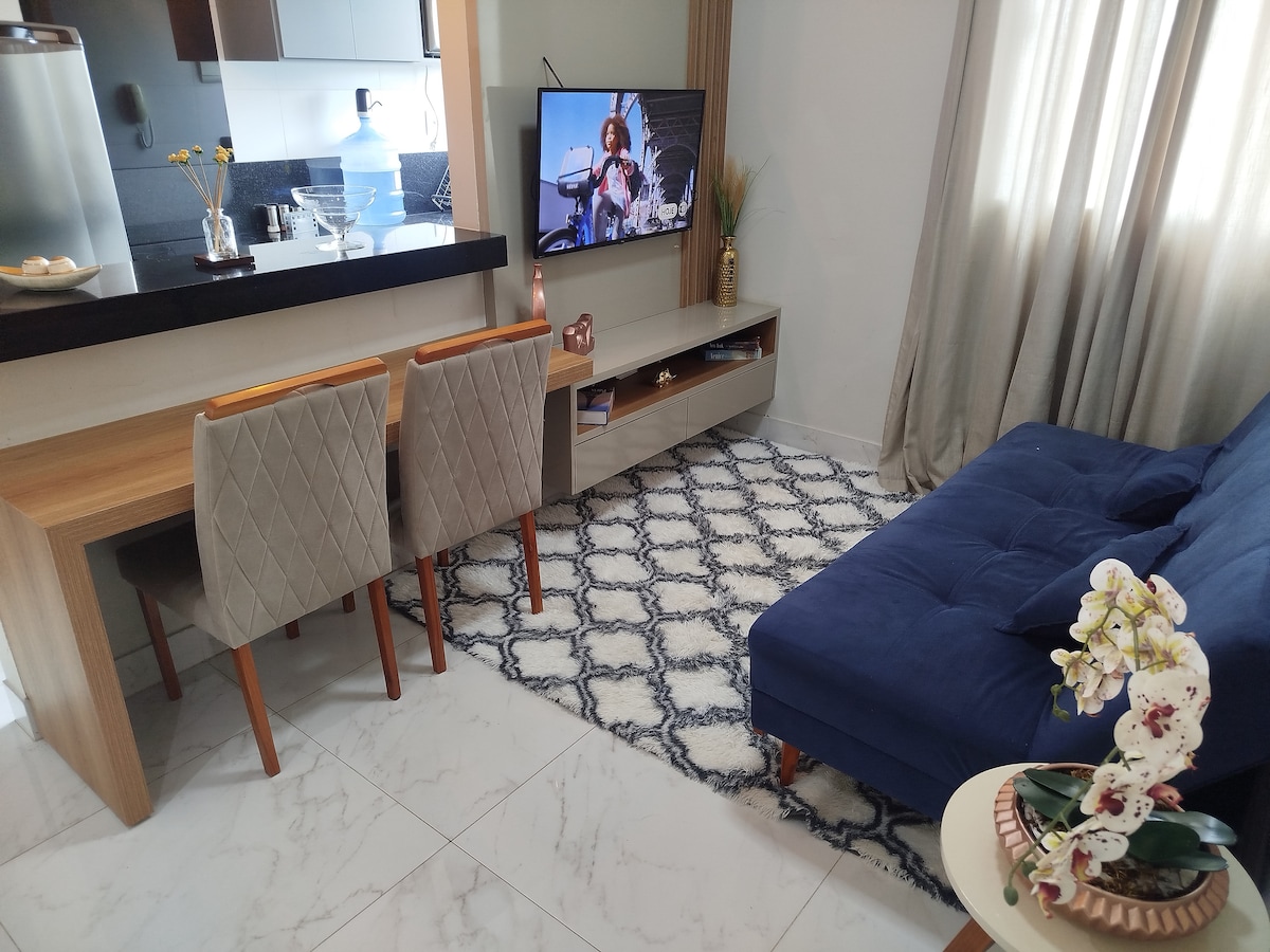 Um lindo e aconchegante apartamento para você se hospedar pertinho do centro! Tudo preparado para você com muito carinho, com tudo novinho, para você ficar por quanto tempo necessitar. Acomodação para até 04 pessoas, sendo 01 cama de casal, e um sofá cama para até 02 pessoas. Toda infraestrutura com ar condicionado, internet Wi-Fi, smartTv, geladeira, mesa, fogão, panelas, airfryer, talheres, copos, filtro de água, roupas de cama e banho, secador,etc